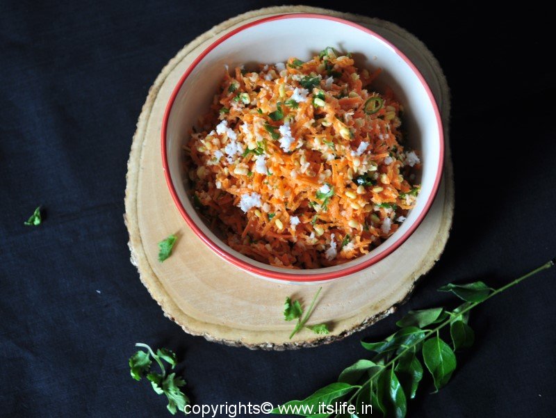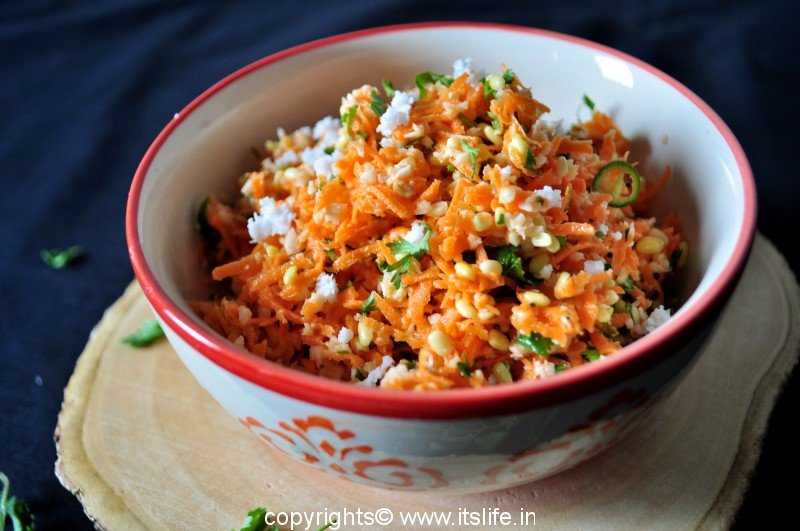 Carrot and Split green gram salad are used to make Carrot Kosambari. Weekly once mom would make this at home while growing up. This habit makes me crave for this Kosambari.