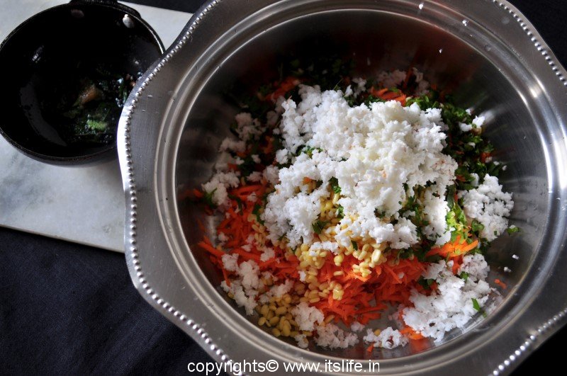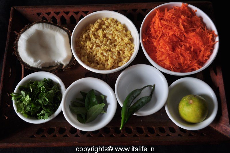 In a salad bowl, mix Carrots, Moong Dal, Coconut, Coriander Leaves, Lemon and Salt. In a small kadai/pan heat Oil and add Mustard seeds and when they splutter, add Green Chilies and Curry leaves.