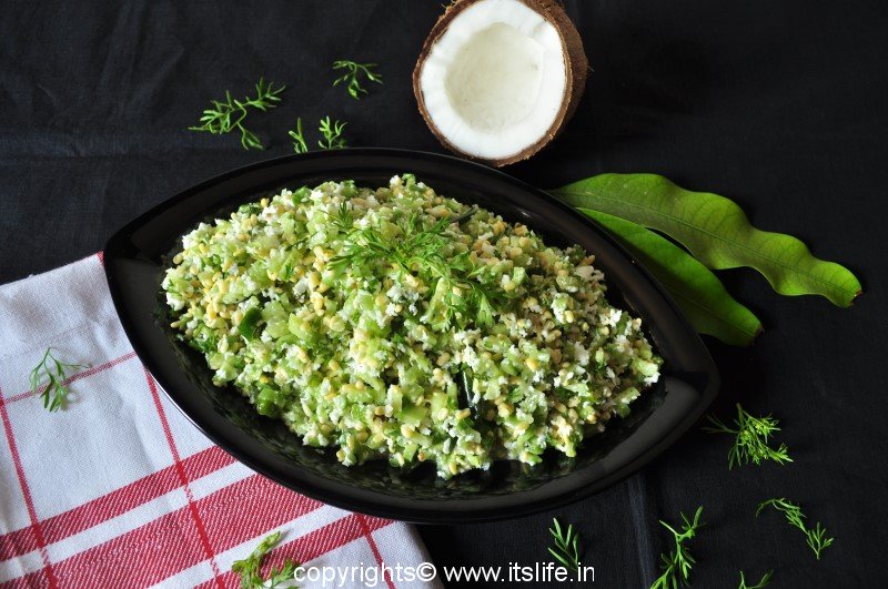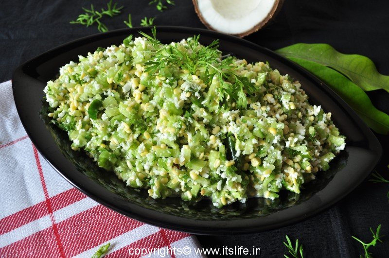 Peel and chop the Cucumber finely. Soak Green Gram for 40 minutes. Mix Cucumber, Green Gram, Coriander Leaves, Green Chilies and Coconut and keep it aside.