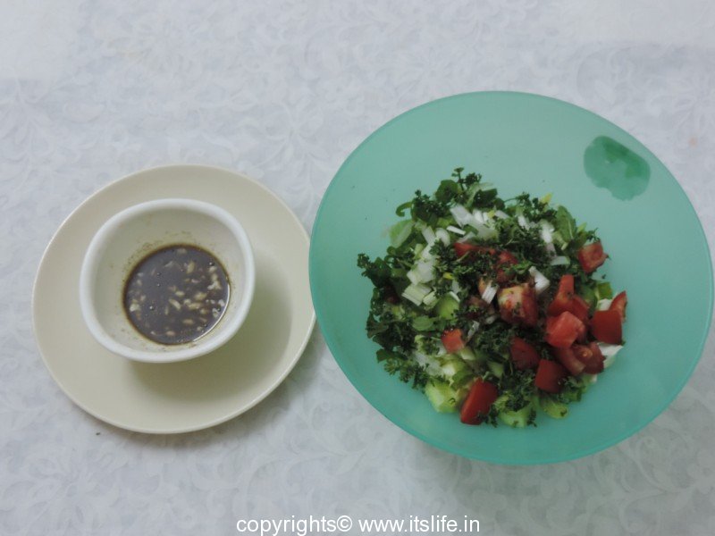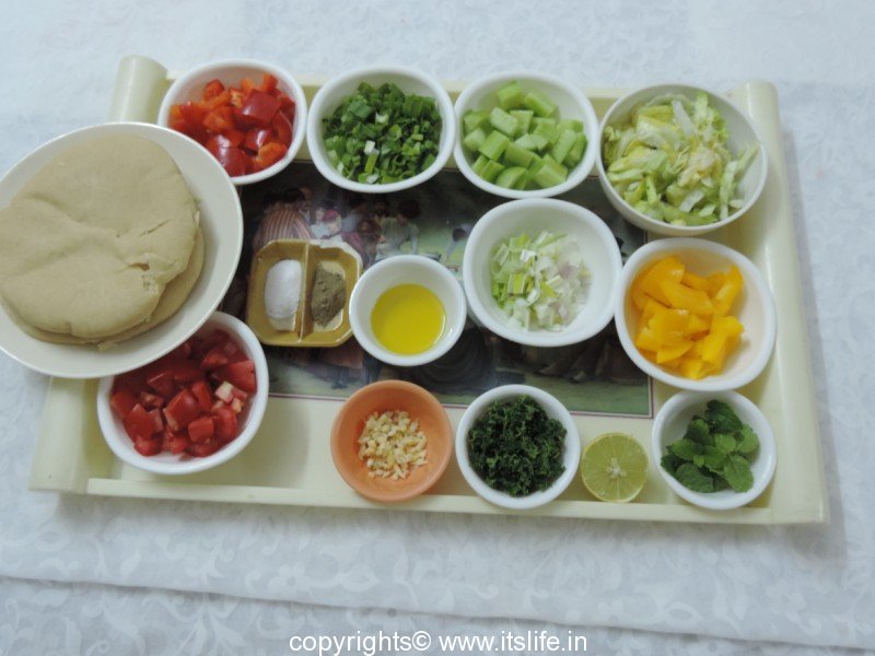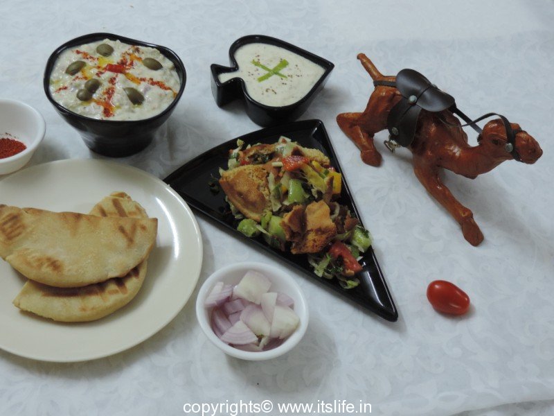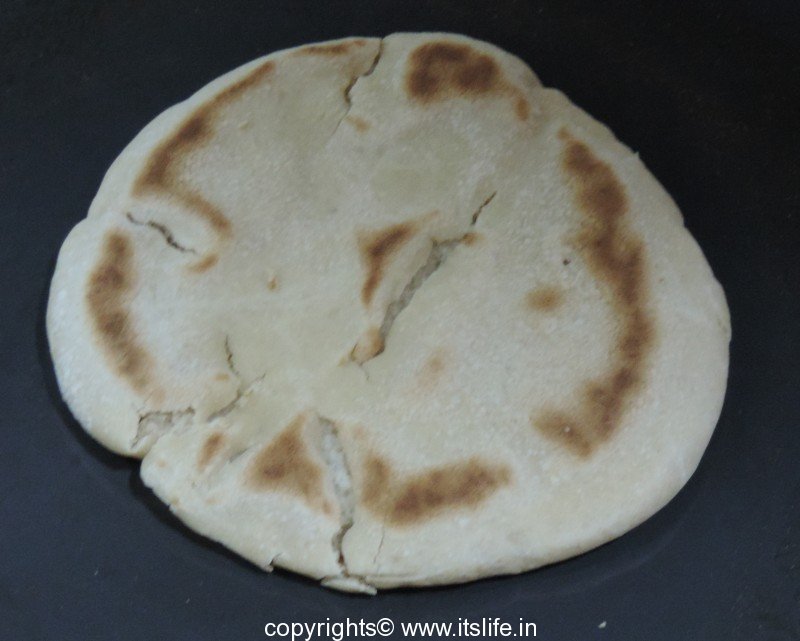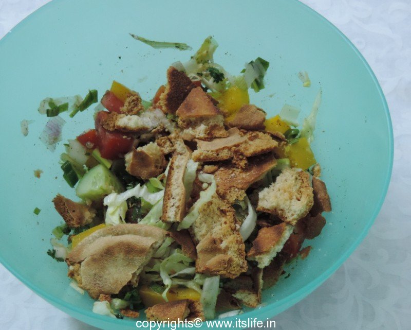 Toast the pita bread on tava (griddle) till it turns golden brown and crisp. Break into small pieces and keep aside.