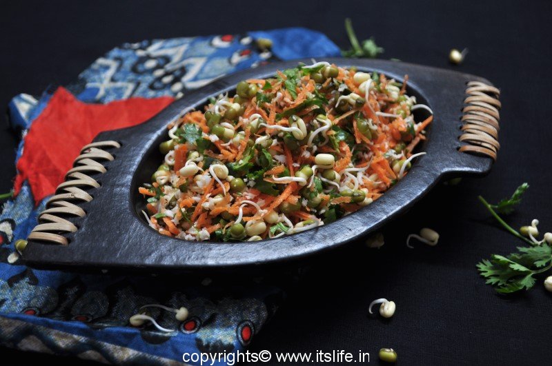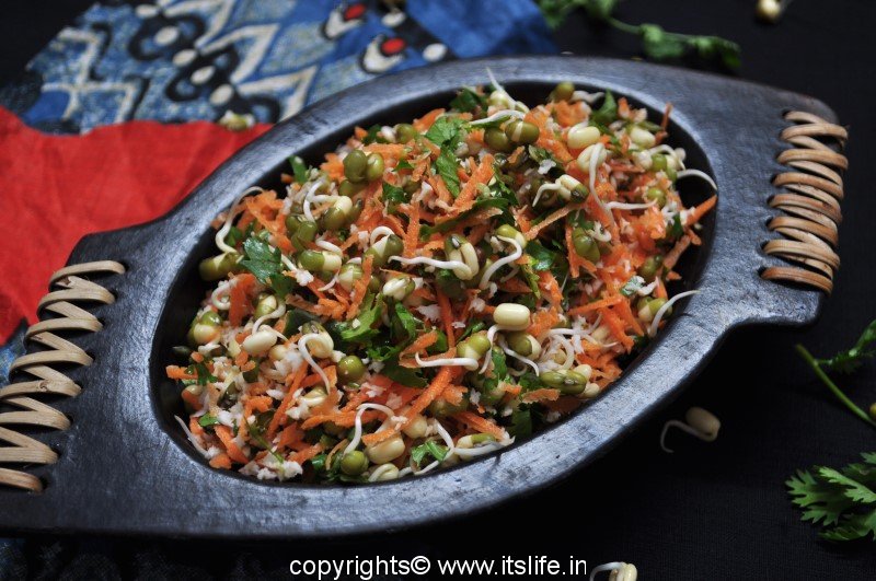 In a salad bowl mix Hesarukalu, Carrot, Green Chilies, Lemon Juice, Coconut, Coriander Leaves and salt and mix well. Heat Oil and add Mustard seeds, when they splutter add Curry leaves. Add this to the Hesarukalu mixture and mix well.
