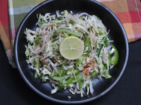 Lachha Salad is a salad prepared using thinly sliced vegetables. It is usually prepared with only Onions, but I have used other vegetables like Cabbage and Capsicum. This salad is usually served with Punjabi dishes in Dhabas.