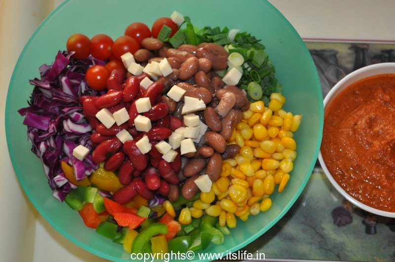 In a salad bowl add the Beans and the vegetables.
