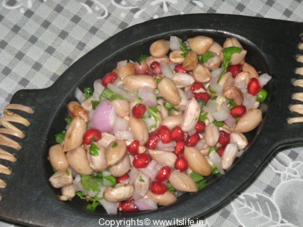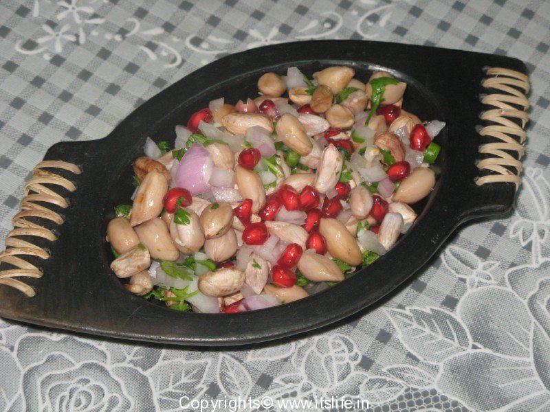 Pressure cook Peanuts with shells in Salt water. Shell the peanuts. Add all the ingredients in a salad bowl and toss.