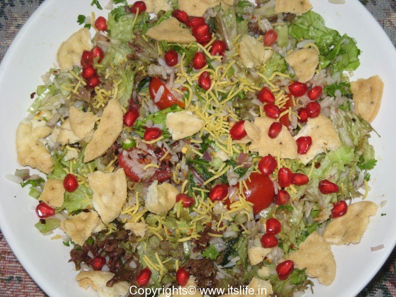 Mix the vegetables, leaves, and poha in a salad bowl. Add the dressing and gently toss. Serve garnished with Sev, Pomegranate, and Papdi.