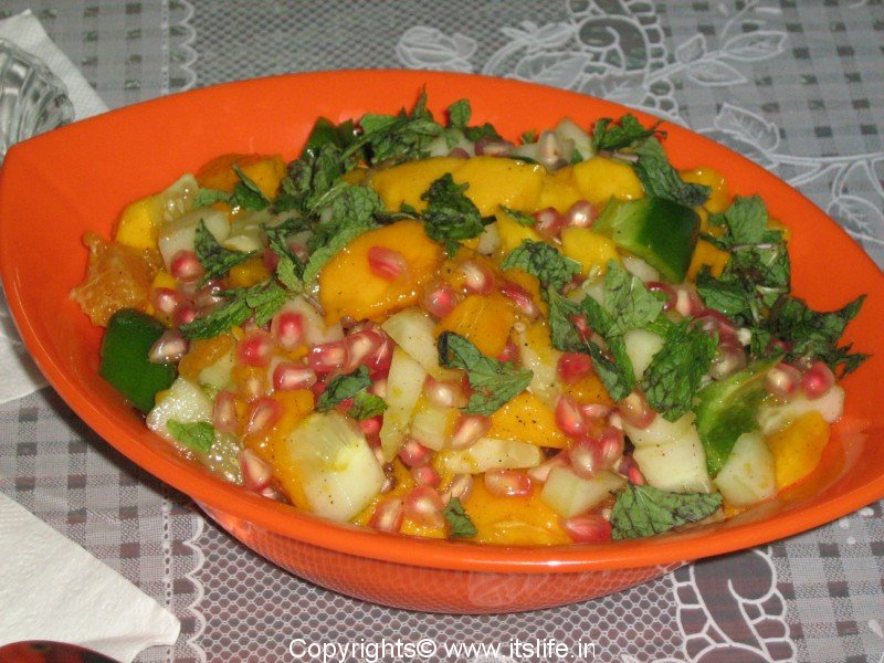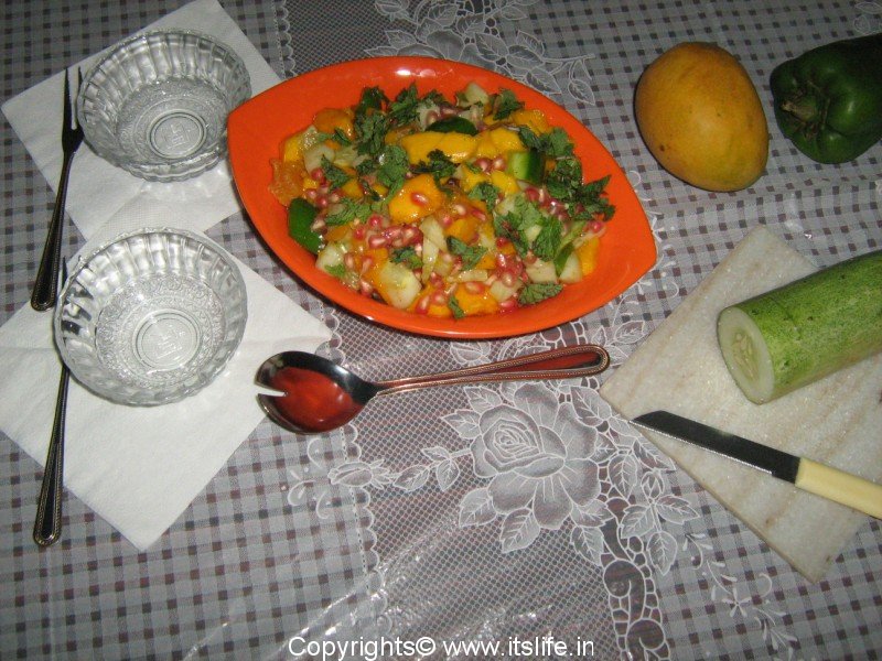Mix the ingredients for dressing in a cup. Mix Mangoes, Pomegranate, Cucumber, Capsicum and Orange in a salad bowl. Pour the dressing over this and toss gently. Garnish with Pudina / Mint and chill for half an hour and serve.