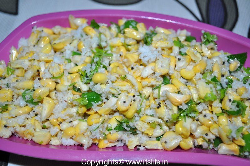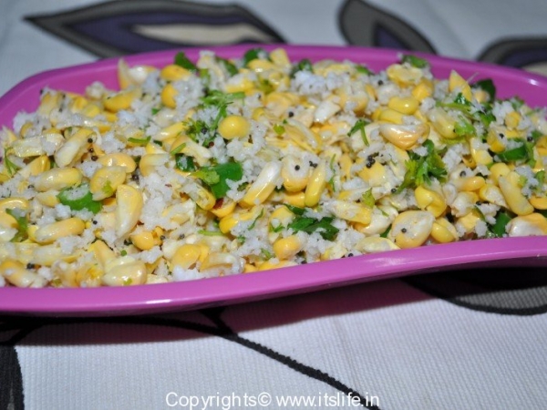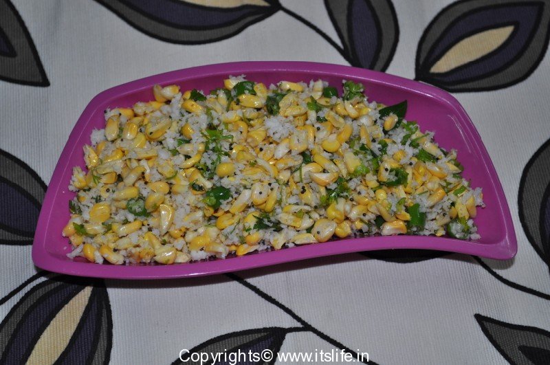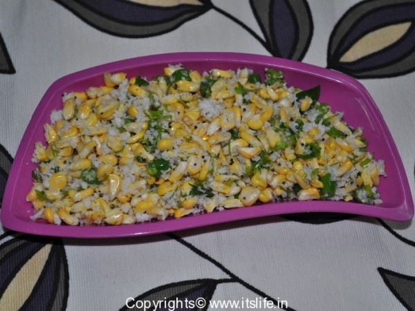 Chop each Sweet Corn Kernel into two. Remove to a mixing bowl. Add Coriander leaves, Green Chili, Lemon Juice, Salt, and Coconut to it and mix well.