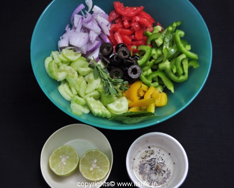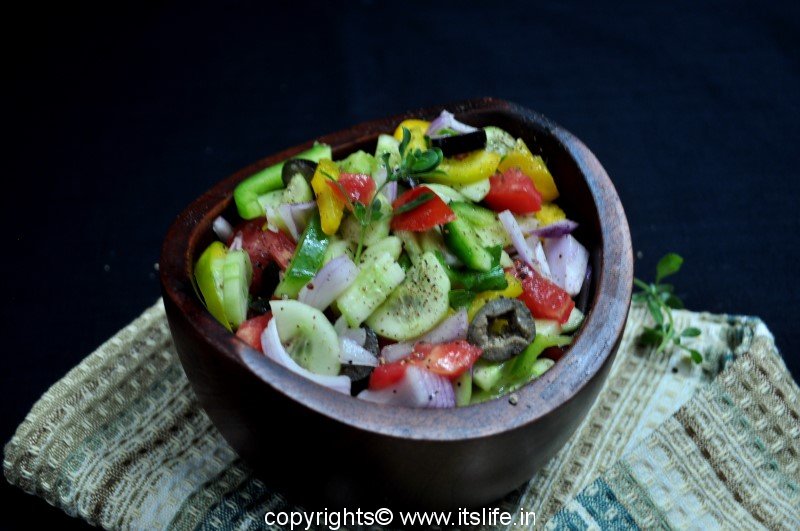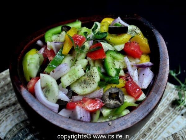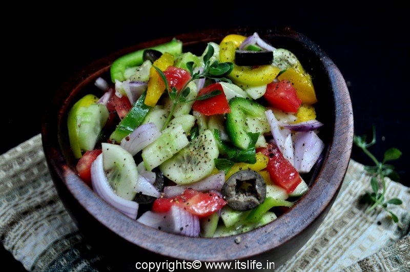 Tossed salad is easy to make and is extremely healthy. I always make this as everybody in the house likes the colors in the salad. This salad goes well with any of the Indian Bread.