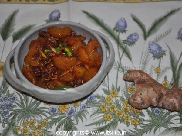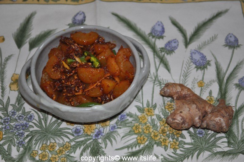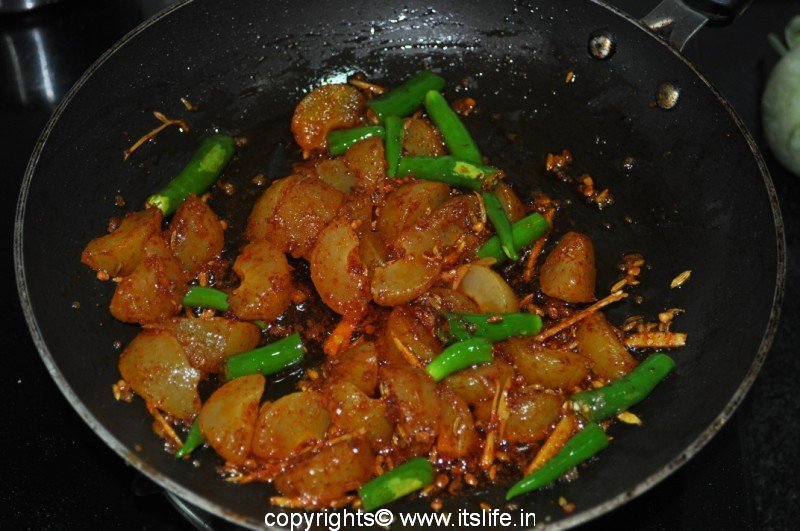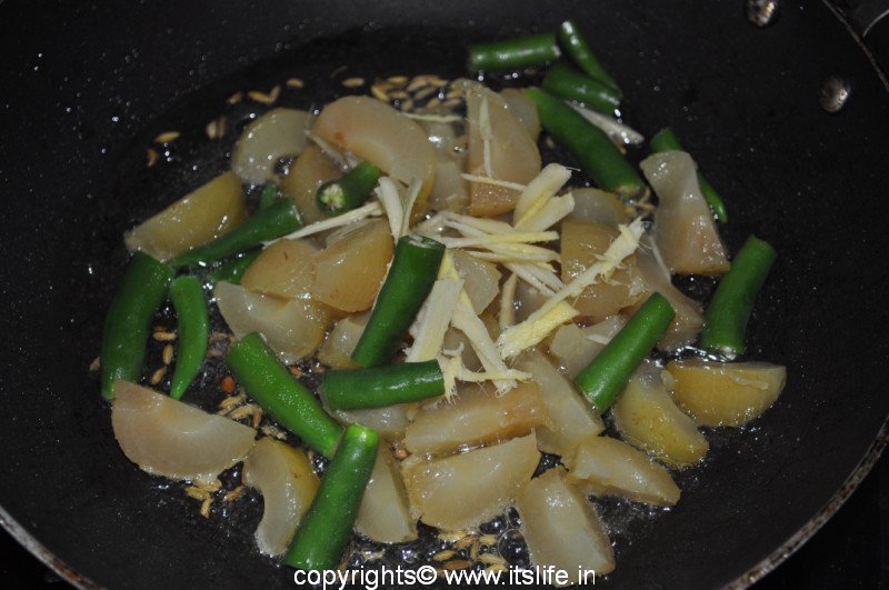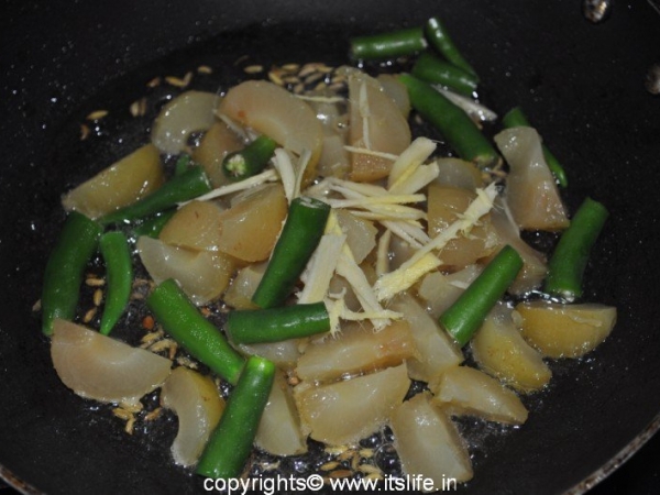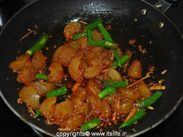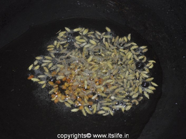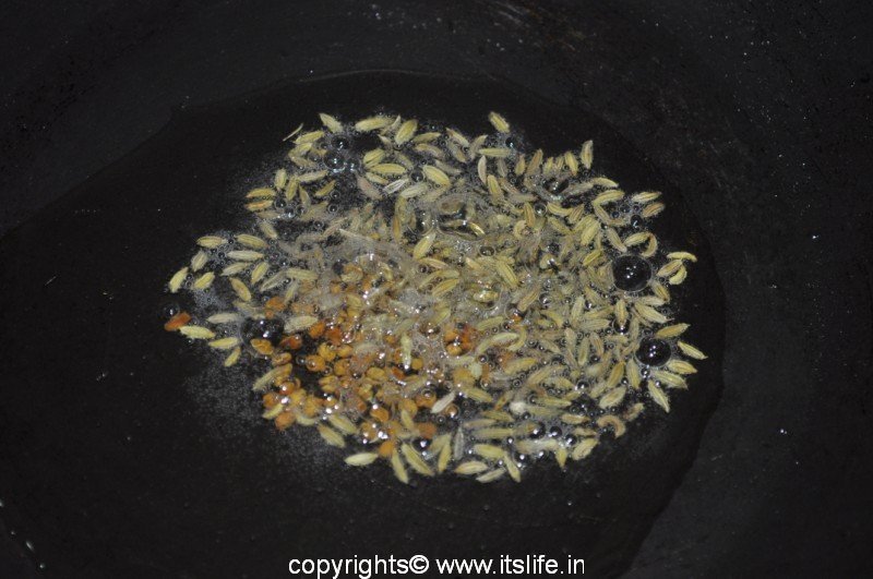 Heat Oil, add Fennel and Fenugreek Seeds. When they splutter, add Chilies, Ginger, and Gooseberry. Stir.