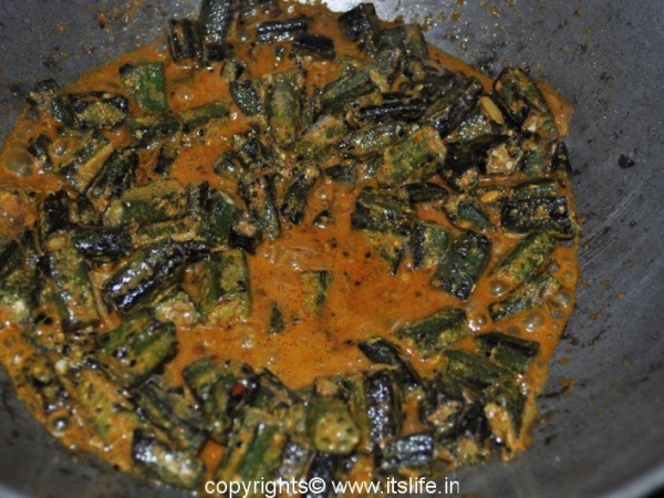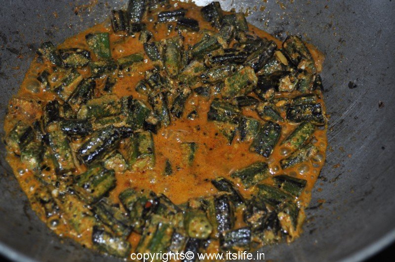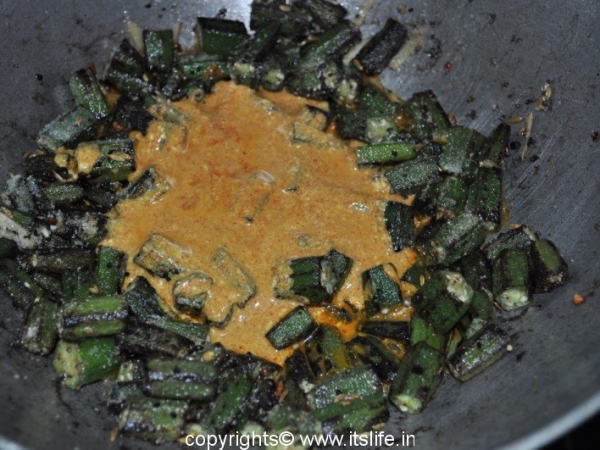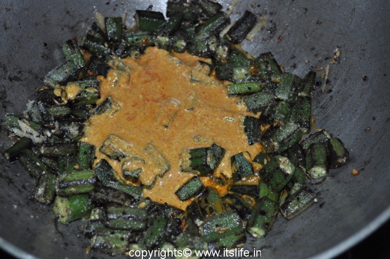 In a bowl add Curds, Chili Powder, Pickle Masala, Turmeric Powder, Dhania – Jeera Powder and mix well. Add this to the Bhindi.