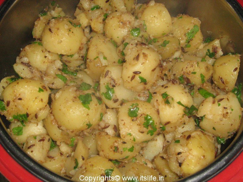 Potatoes cooked with Carom Seeds. This recipe is from North India.