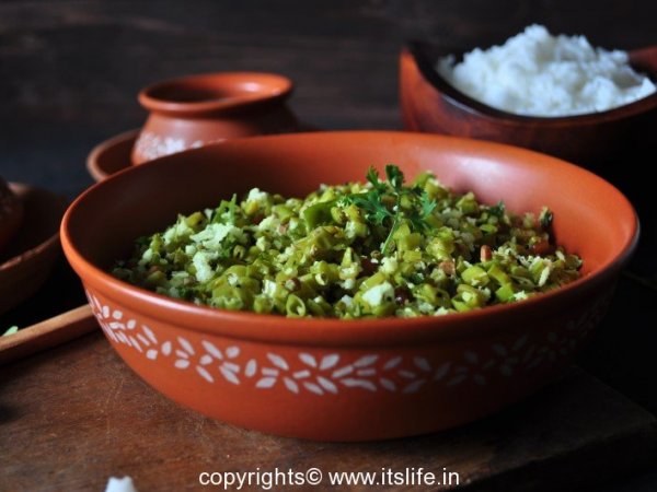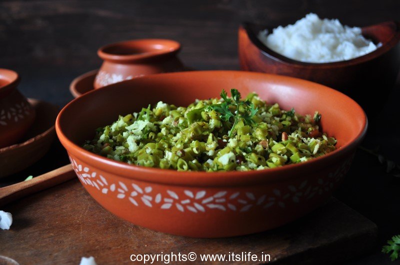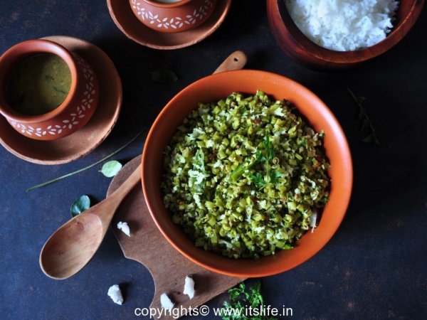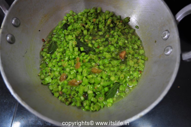 Close the kadai and let it cook for 5 minutes on medium flame. Add Coconut and Coriander and mix well. Remove Alasande Palya to a serving bowl.