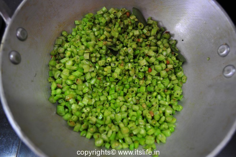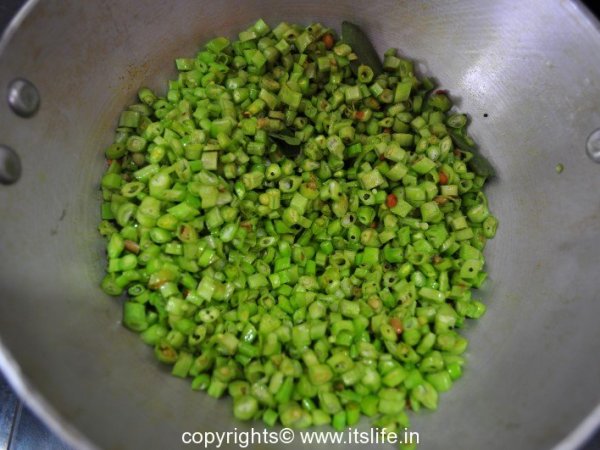Wash Alasande and chop finely, slit the Green Chilies. Heat Oil in a kadai/pan and add Bengal Gram and Urad Dal and fry until they turn pink. Next add Mustard Seeds and when they splutter add Turmeric Powder, Curry Leaves and the chopped Beans.