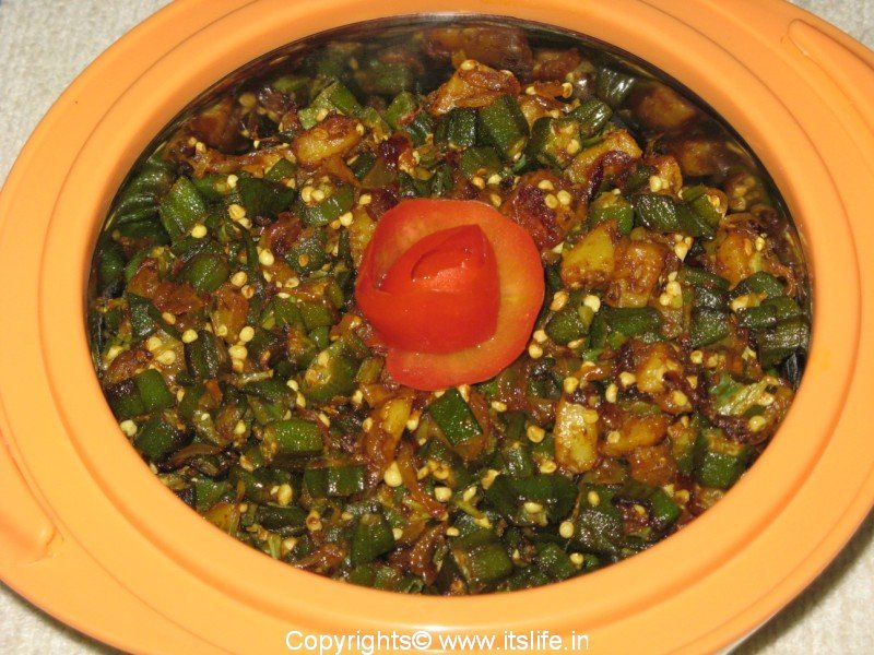 An unusual combination of Potatoes and Okra mixed with spices.