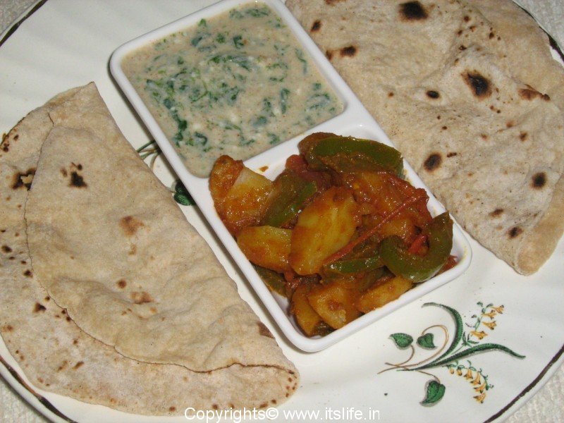 Heat Oil in a pan, add Onions and sauté until they turn translucent, and next add Potatoes and stir fry for two to three minutes. Add Capsicum and sauté. Add Tomatoes and mix well and close the pan for a minute. Open the pan and stir. Add Chili, Coriander, Aamchur, Cumin and Turmeric Powder and mix well. Remove to a serving bowl and garnish with Coriander leaves and serve hot with Palak Raitha, Phulka or Paratha.