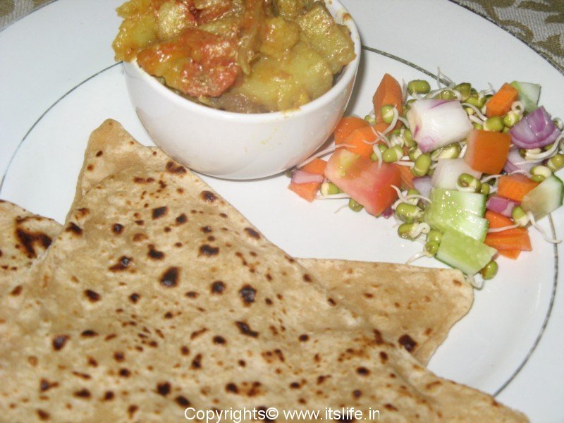 Chop Cauliflower into big florets and keep it aside. Heat Oil in a Kadai / pan and add Green Chilies, Onions, Tomatoes and sauté for 2 minutes. Add Potatoes and Cauliflower and stir-fry until they are tender. Add Salt and stir. Remove to a serving dish and garnish with Coriander. Serve hot with Phulka or Paratha.