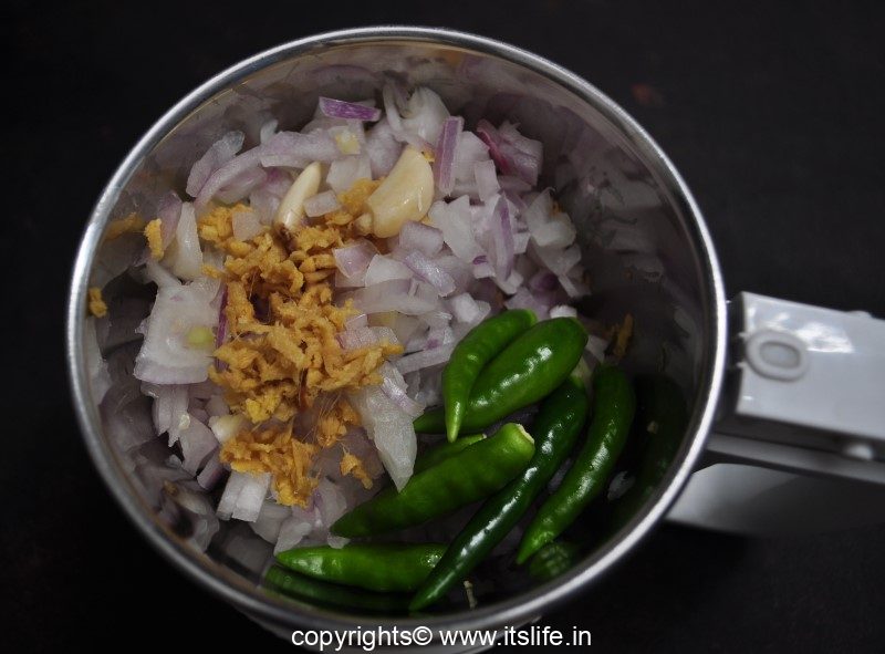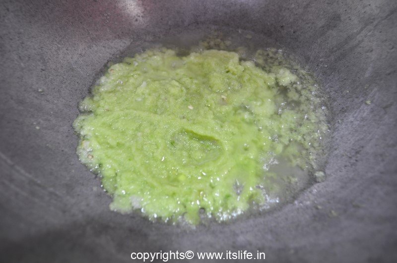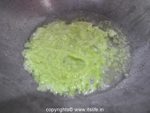 Heat oil in a kadai / pan, add the masala paste and stir fry until the moisture evaporates.