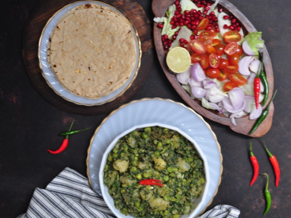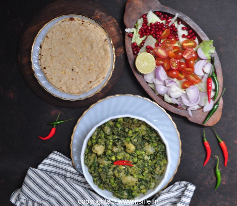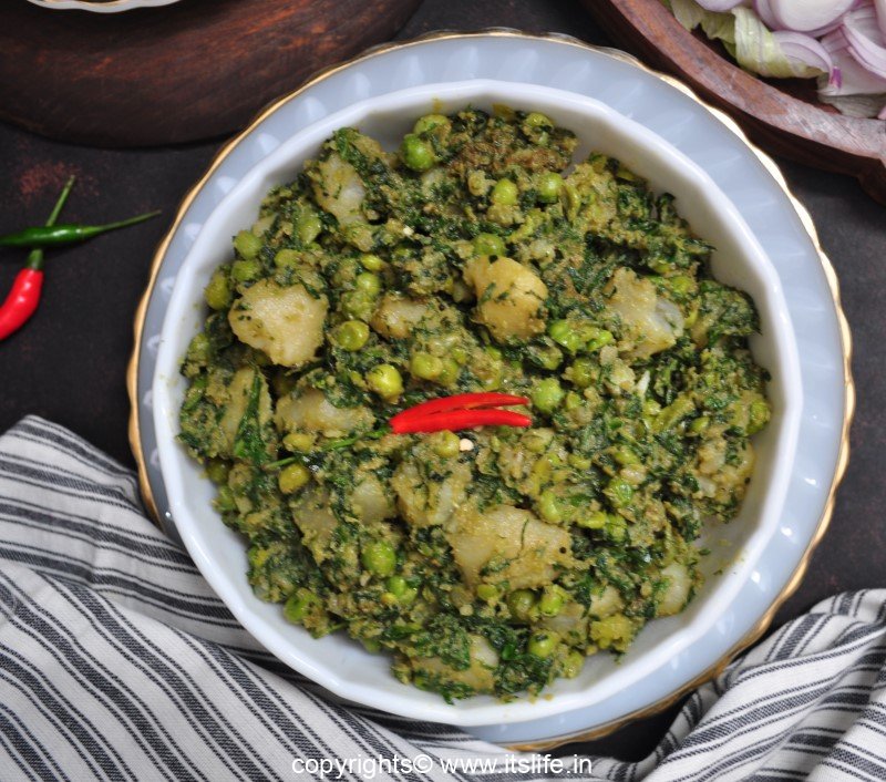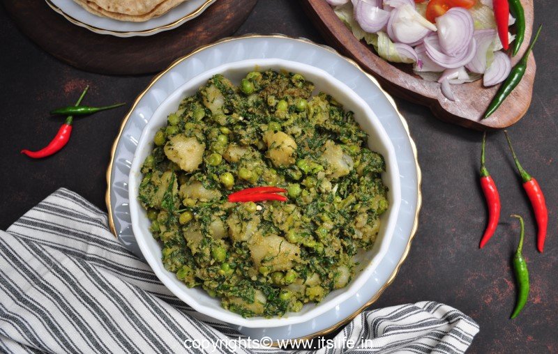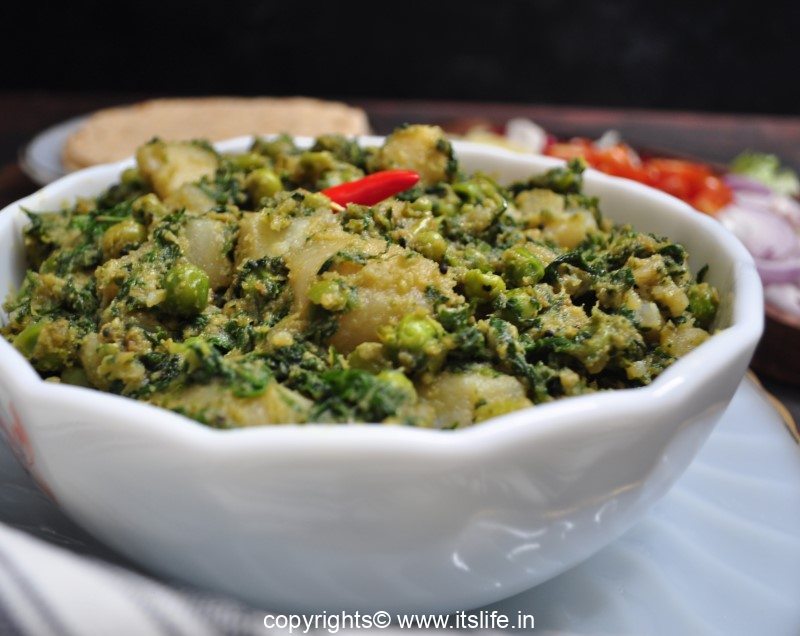 I learnt to make this dish from my Mami/Aunt, who is a wonderful cook. This North Indian side dish goes very well with all types of Indian Bread and is prepared using Potatoes, Fenugreek and Spinach Leaves and fresh Peas.