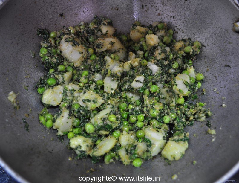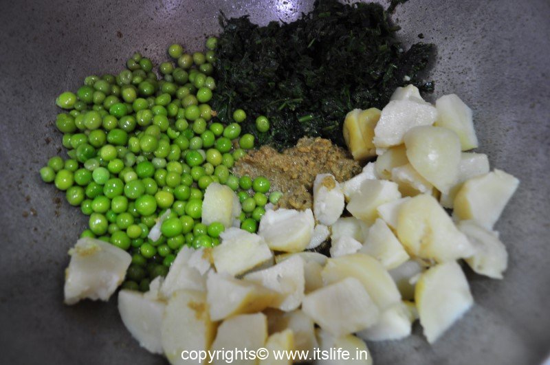 Add Coriander Powder, boiled Peas, Potatoes, and the mashed leaves to the masala.