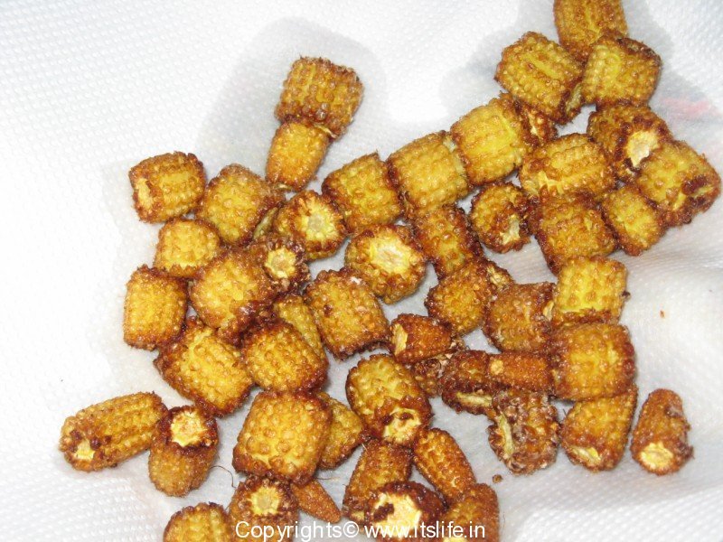 Heat Oil and deep fry the baby corn till brown or steam baby corn if you are calorie conscious.