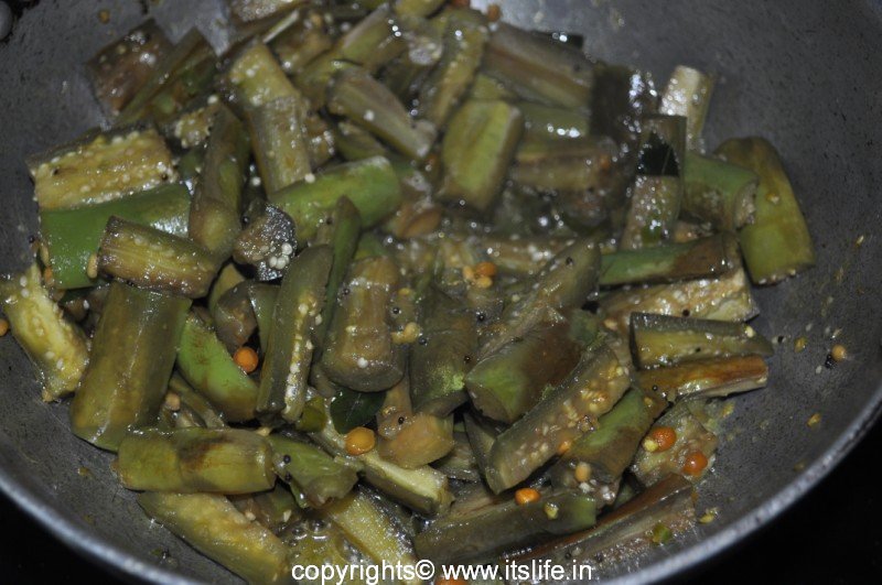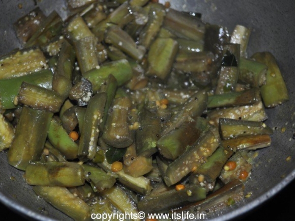 Heat Oil, add Bengal Gram and Urad Dal and fry them until they turn pink. Add Mustard Seeds and when they splutter, add Turmeric powder. Add Green Chilies, Curry leaves and Badanekayi/Baingan pieces and stir, add Jaggery, and Salt and mix well.