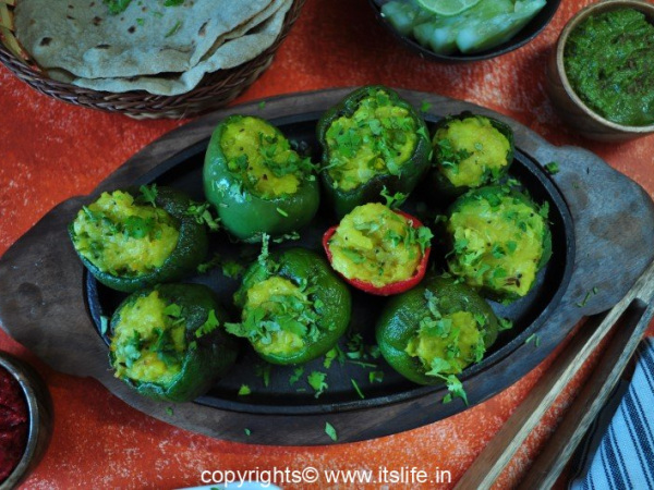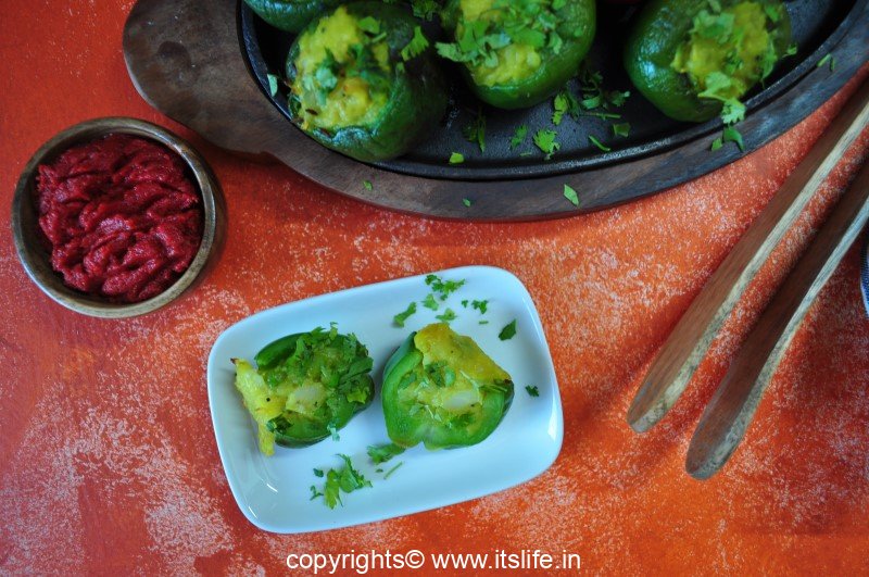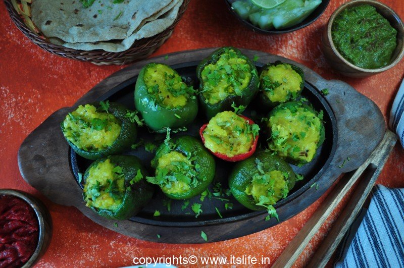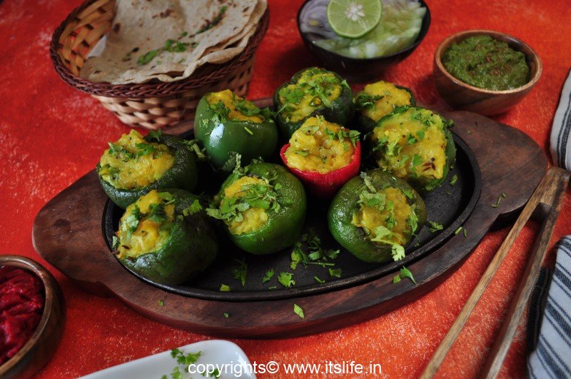 Potatoes goes with anything and almost everyone’s favorite. When you stuff spiced potatoes in Capsicum, the dish becomes even more irresistible. I have seen tiny Capsicums in the market during December and again in June. Try this recipe and let me know how it turns out.