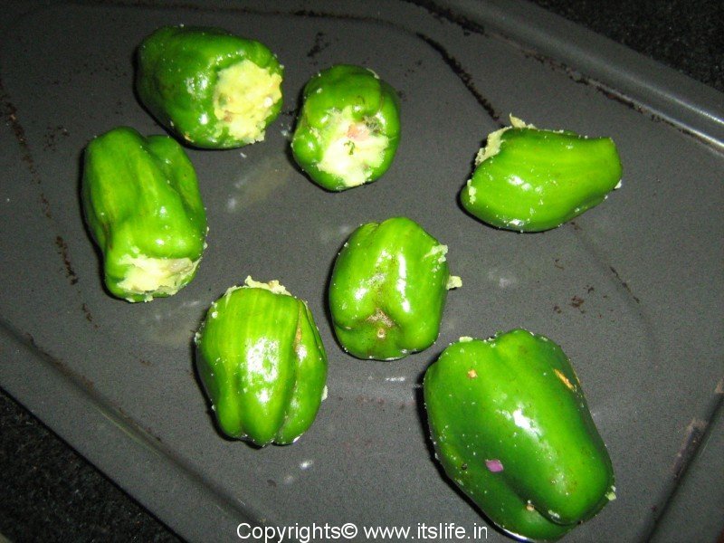 Make a mixture of Oil and ½ tsp Salt and smear this over the Capsicums. Fill vegetable mixture into the Capsicums.