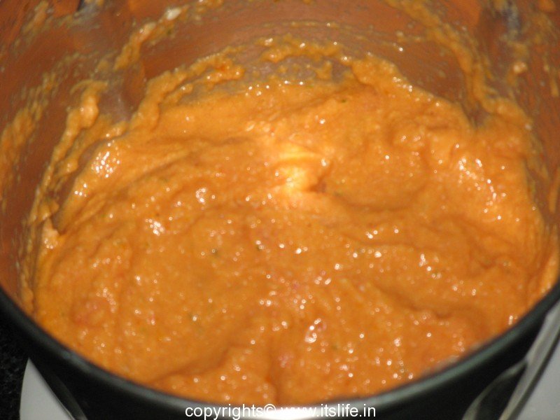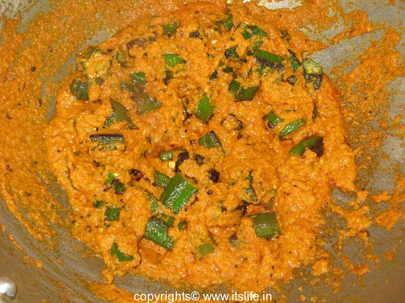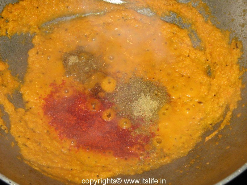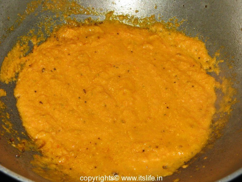 Heat 2tbsp Oil and add Mustard Seeds, and when they splutter, add Jeera and Turmeric Powder. Add the ground Masala and cook until the moisture evaporates.