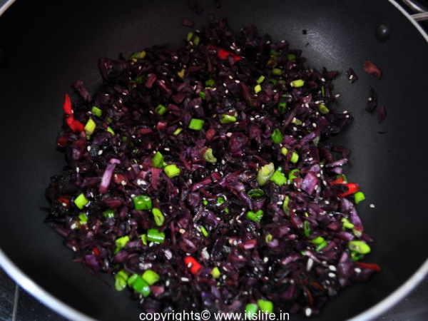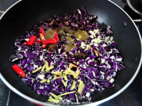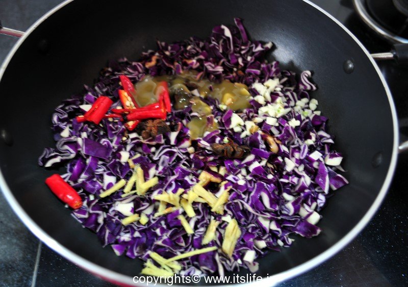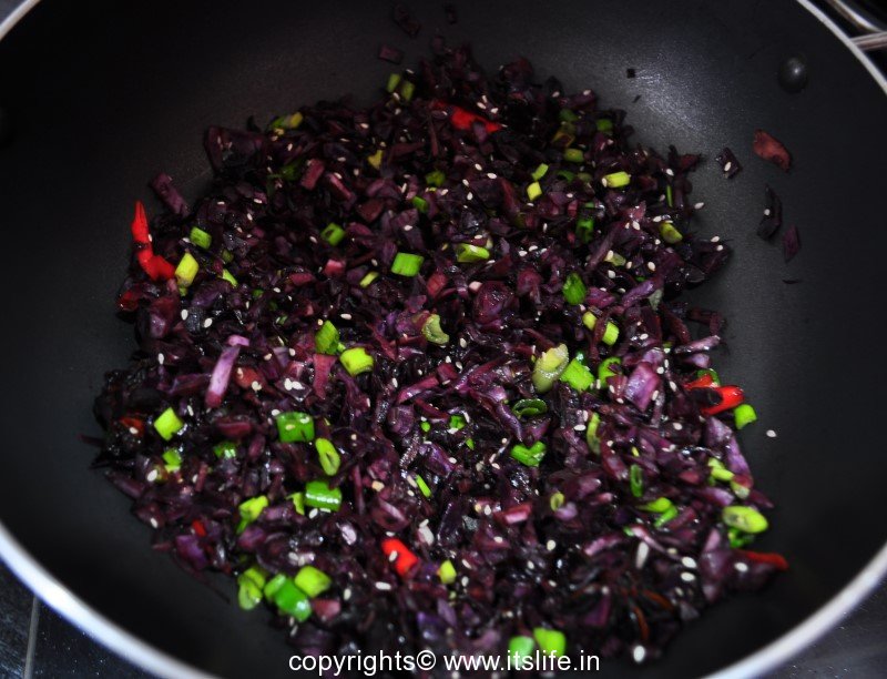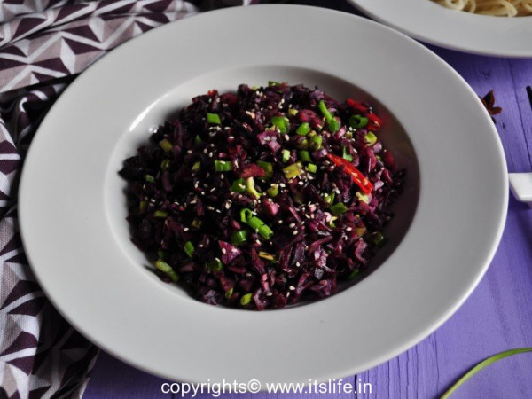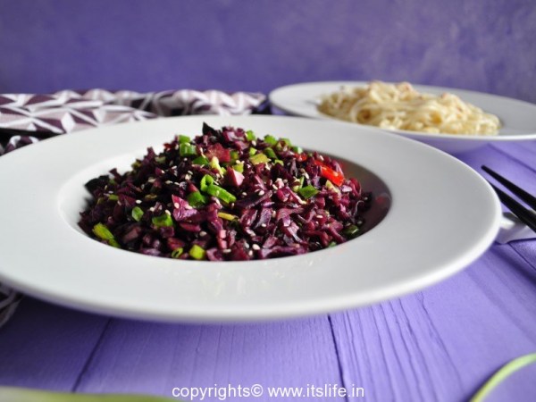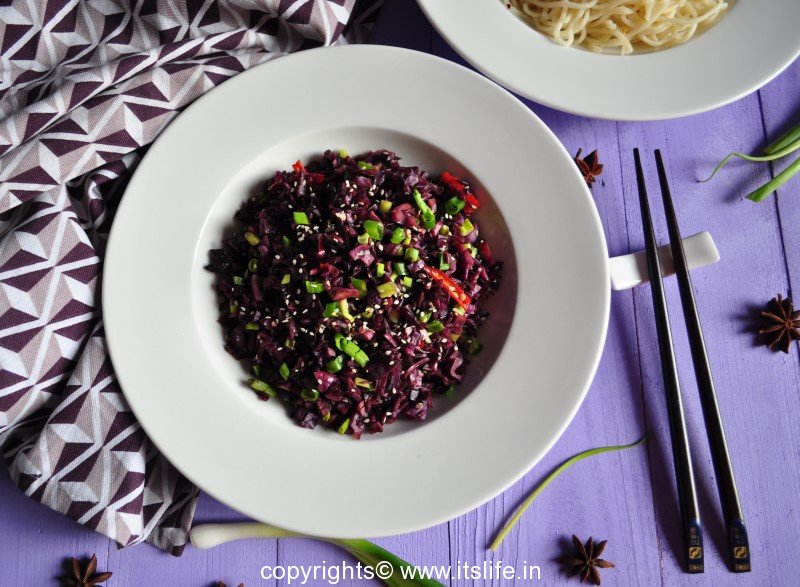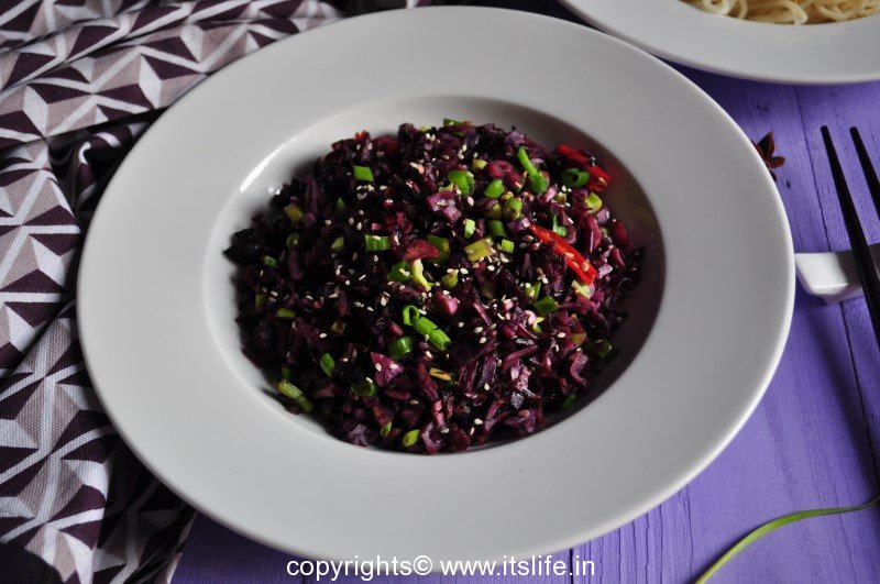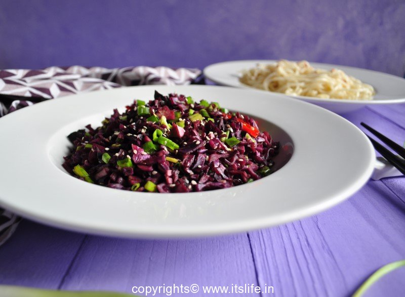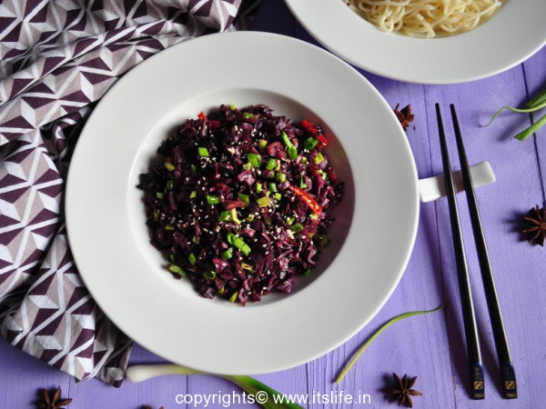 This is a simple stir-fry dish using purple cabbage. You can serve with either Rice or Noodles.