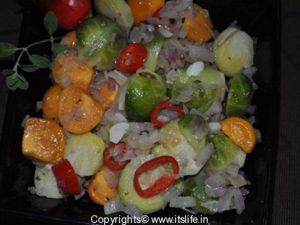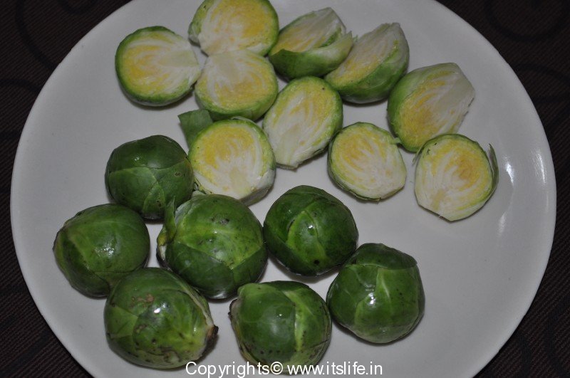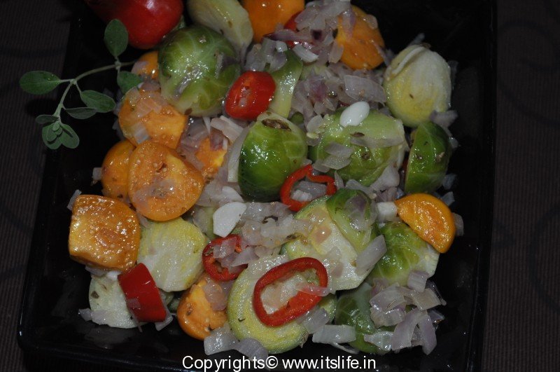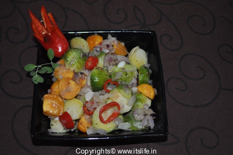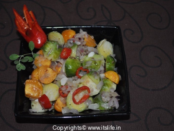 A simple stir fry using Brussels Sprout. This exotic vegetable was introduced by the British and is grown in Ooty and other hill stations across the country.