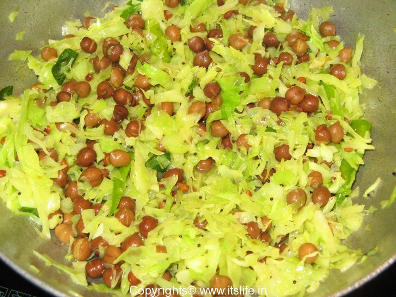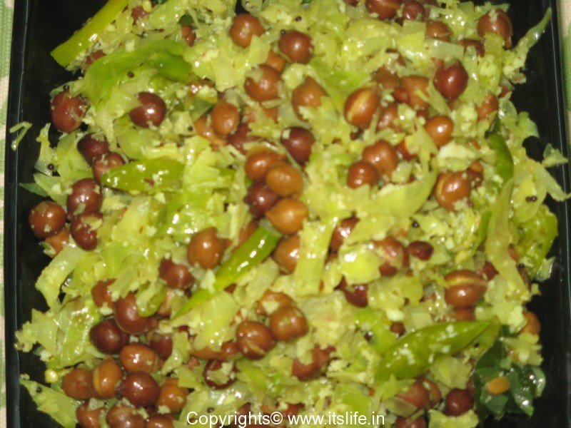 Cabbage Kadale Kalu Palya is prepared with Cabbage and Chickpea.