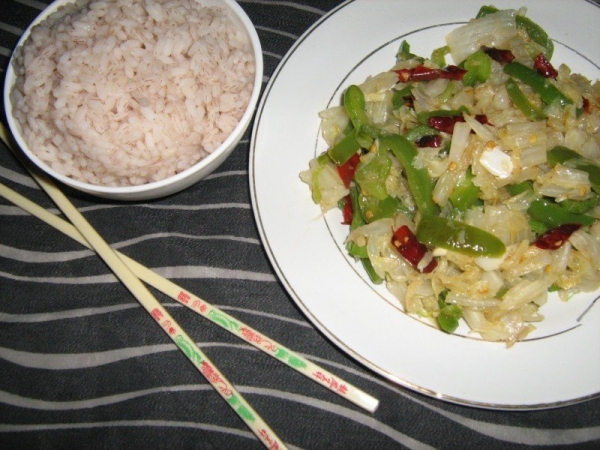 Chop Capsicum into thin strips. Chop each dry Red Chili into 3 to 4 pieces. Heat Oil and add Ginger, Red Chilies, Cabbage, Capsicum and stir for 2 to 3 minutes. Add Salt and toss. Remove to a serving dish and serve Chinese Cabbage Stir Fry with boiled rice.
