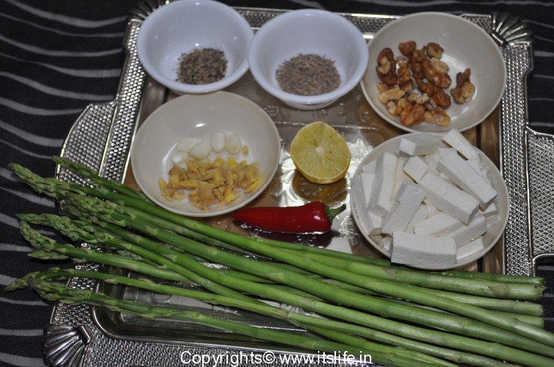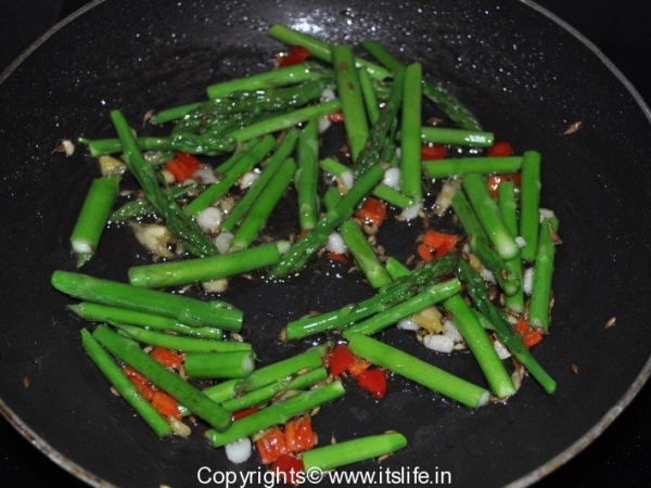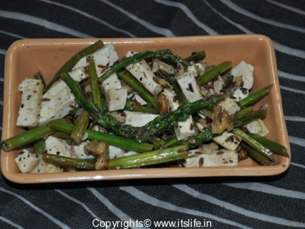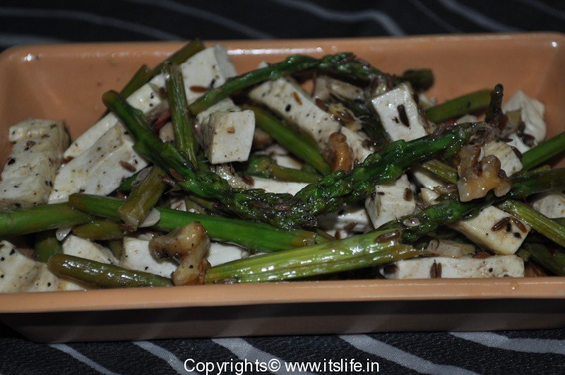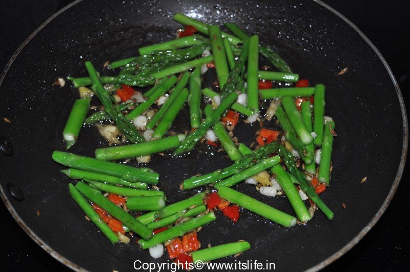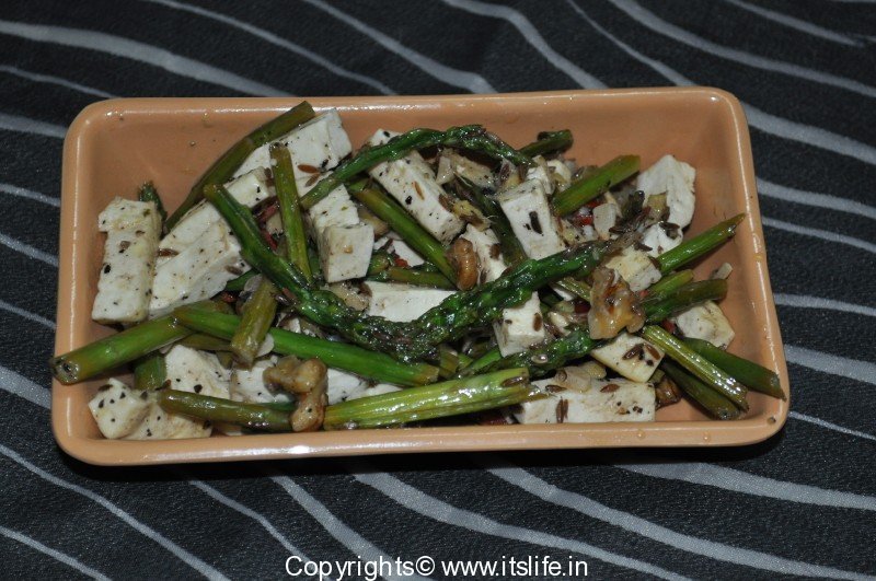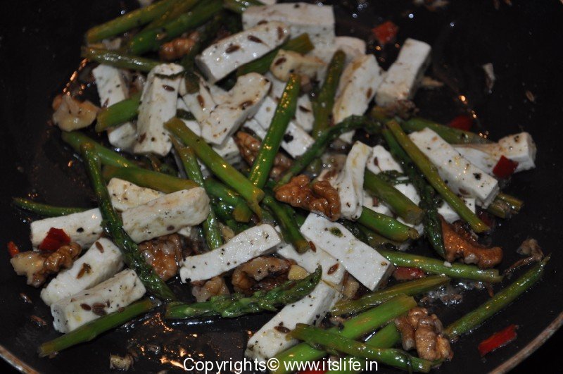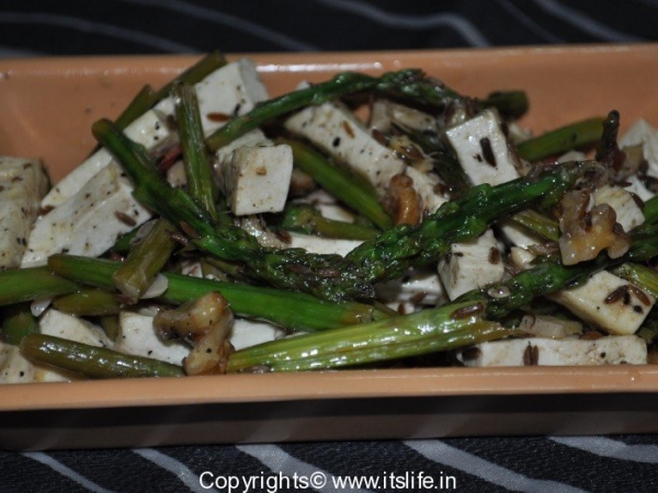 Heat Oil, add Cumin Seeds, Garlic, Ginger, Red Chili and sauté for 10 seconds. Add Asparagus, Walnuts and sauté until tender.