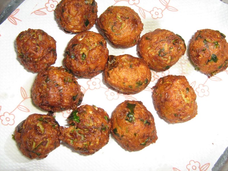 Squeeze Doodhi and reserve the squeezed out water, add Besan, Salt, Green Chilies, Onions, Ginger, Coriander leaves and Garlic to Doodhi. Heat Oil for deep-frying in a kadai and divide the mixture into small balls/Kofta and deep fry till golden brown. Remove on a kitchen towel and keep it aside. Kofta is ready as shown in the picture below.