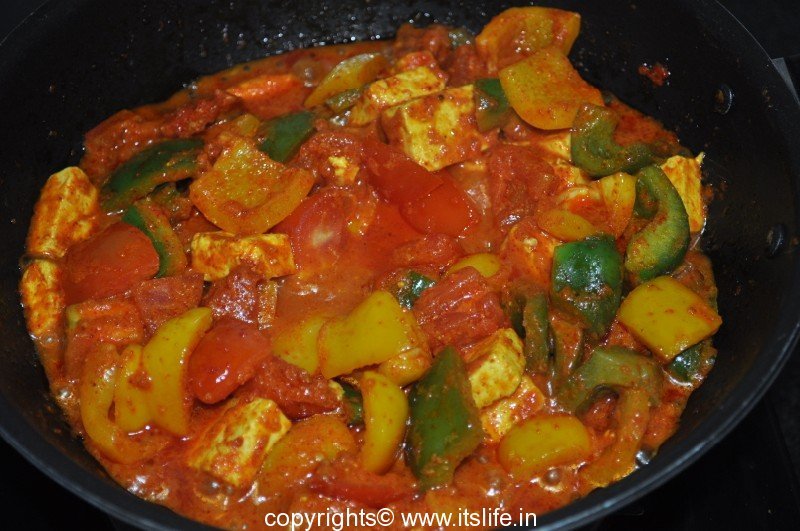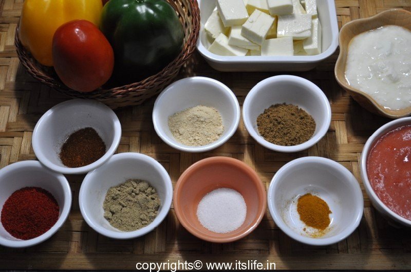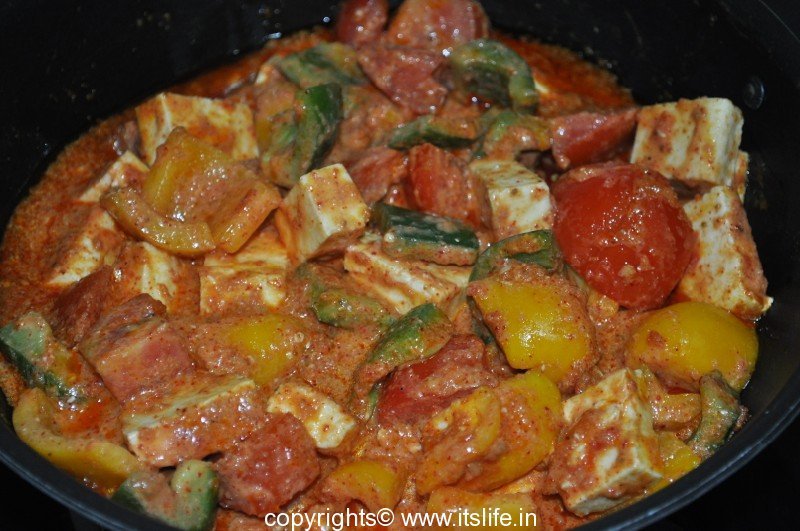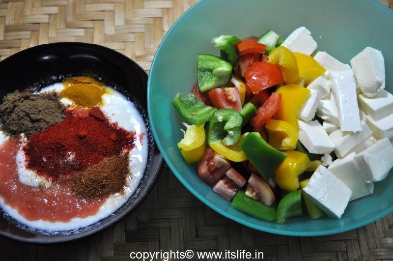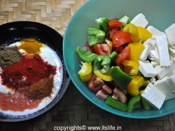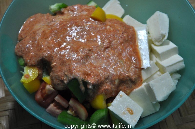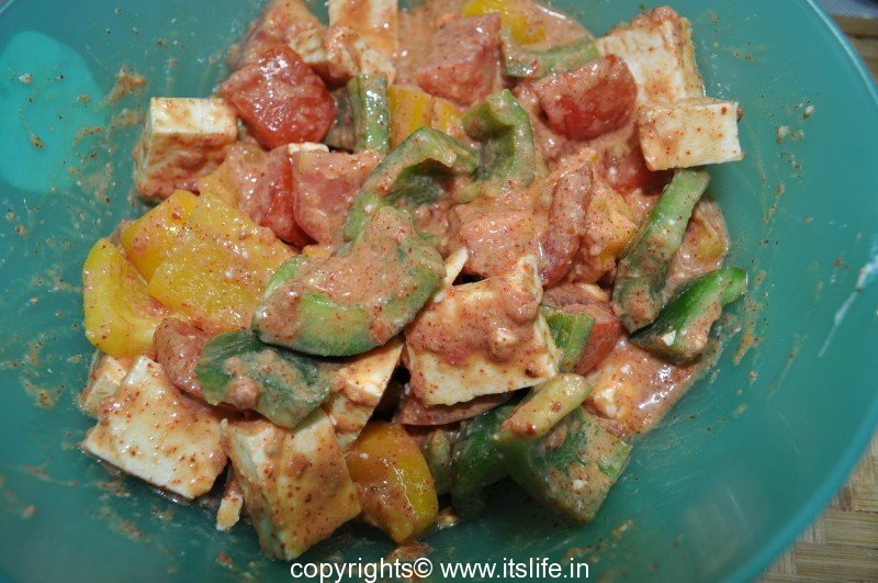 Add Capsicum, Tomato, and Paneer into the marinade and gently toss. Leave it aside for 5 to 10 minutes.