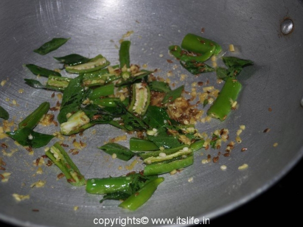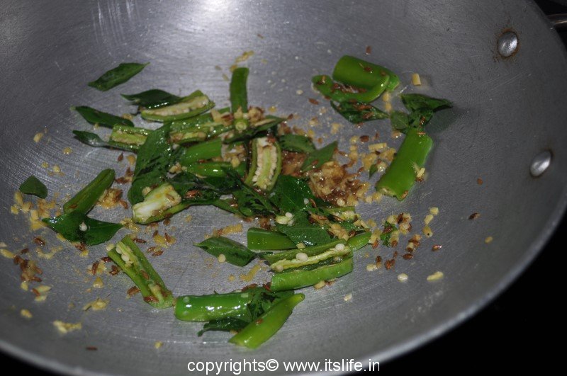Heat Oil, add Jeera, Asafoetida, Turmeric Powder, and Chilies.