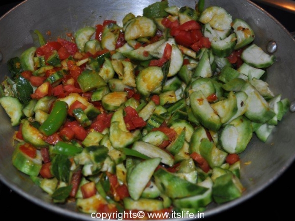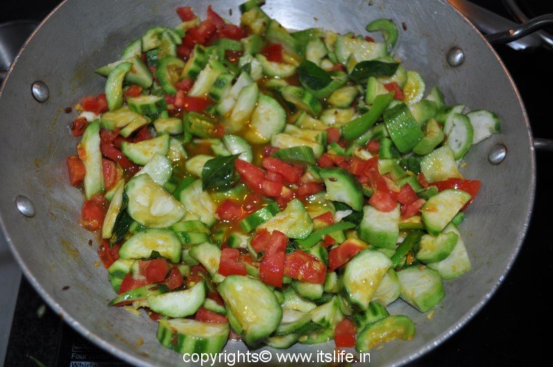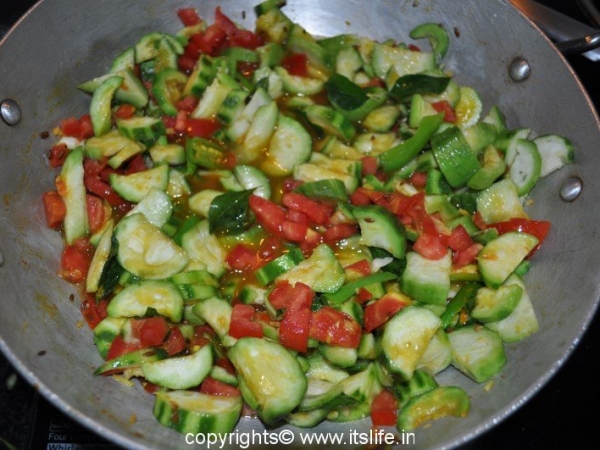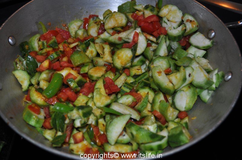 Add Tomatoes and cook for a minute or two. Add Ridge Gourd pieces and mix well.