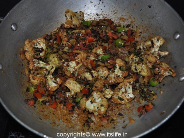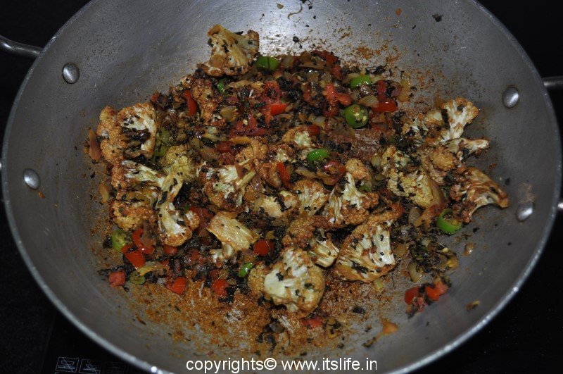 To this add Coriander Powder and Aamchur Powder and cook for another minute. Add Kasoori Methi and mix and cook for another minute. Add Cauliflower, Salt and Sugar and mix well.