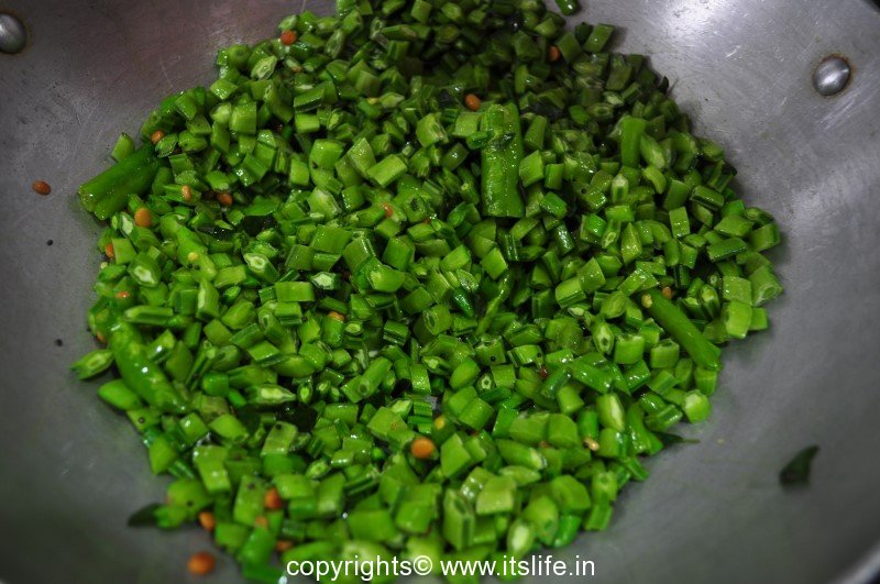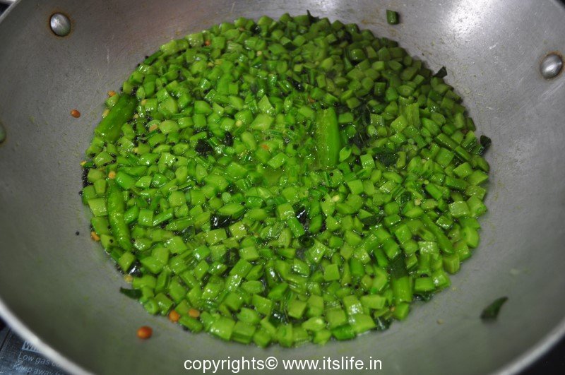 String the Cluster Beans and chop finely, slit the Green Chilies. Heat Oil in a kadai/pan and add Bengal Gram and Urad Dal and fry until they turn pink. Next add Mustard Seeds and when they splutter add Turmeric Powder, Green Chilies, Curry Leaves and the chopped Beans.