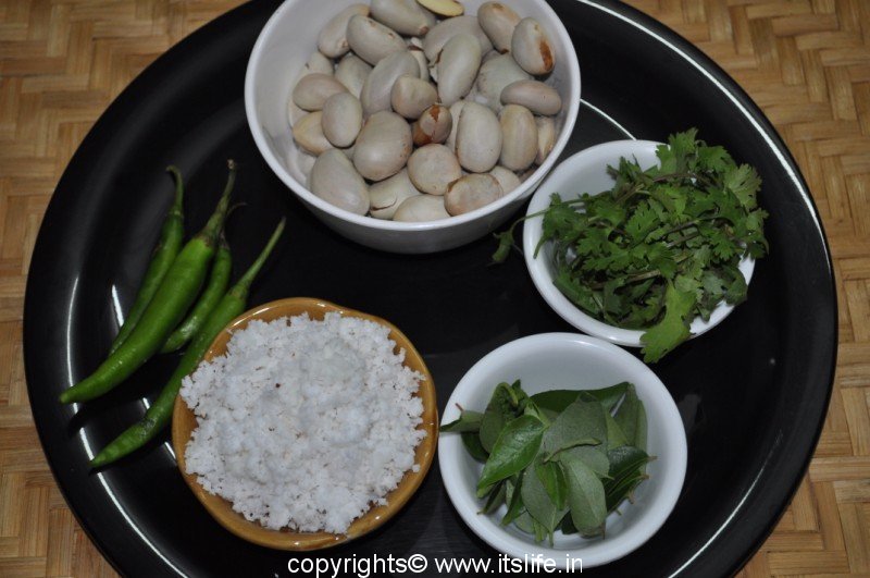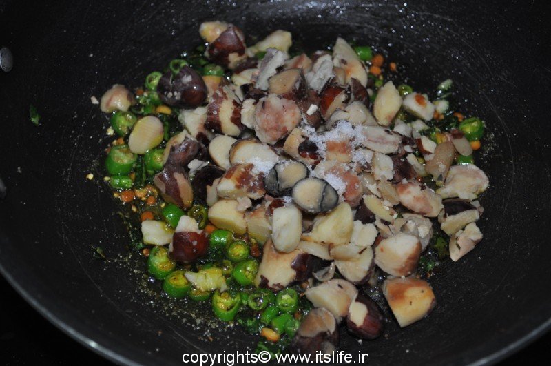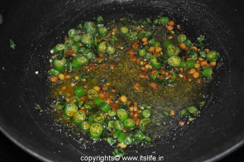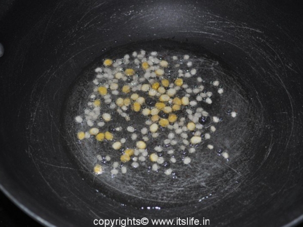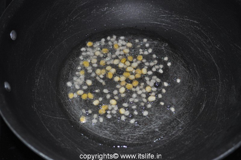 Cook the seeds in the cooker. Remove the hard layer. Dice them. Chop the Green Chilies. Heat Oil in a kadai/pan and add Bengal Gram and Urad Dal and fry until they turn pink.