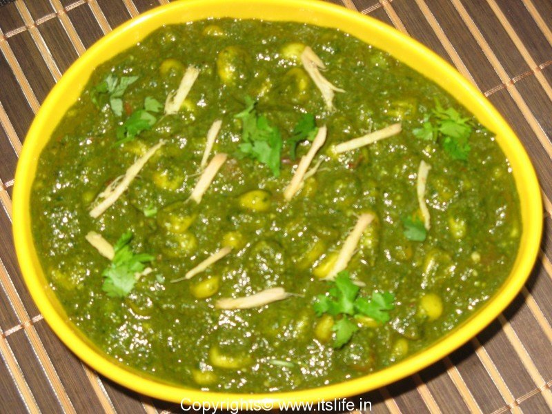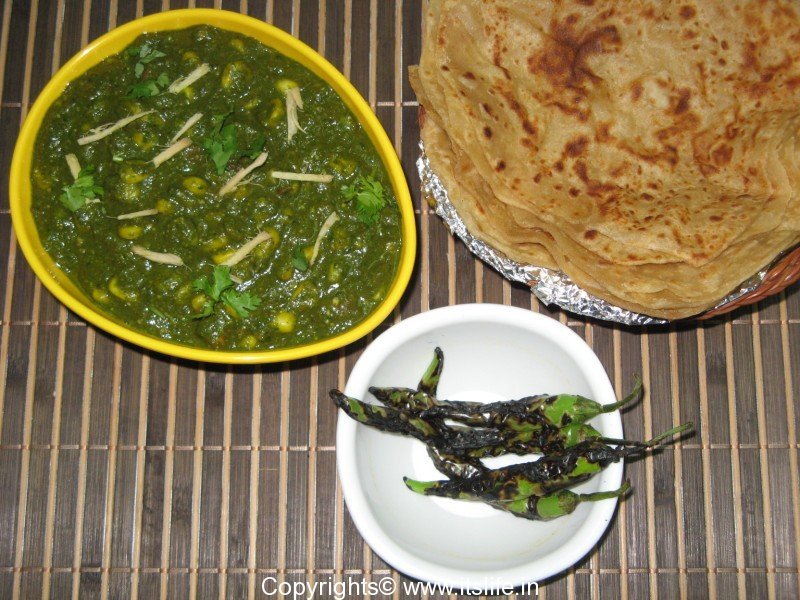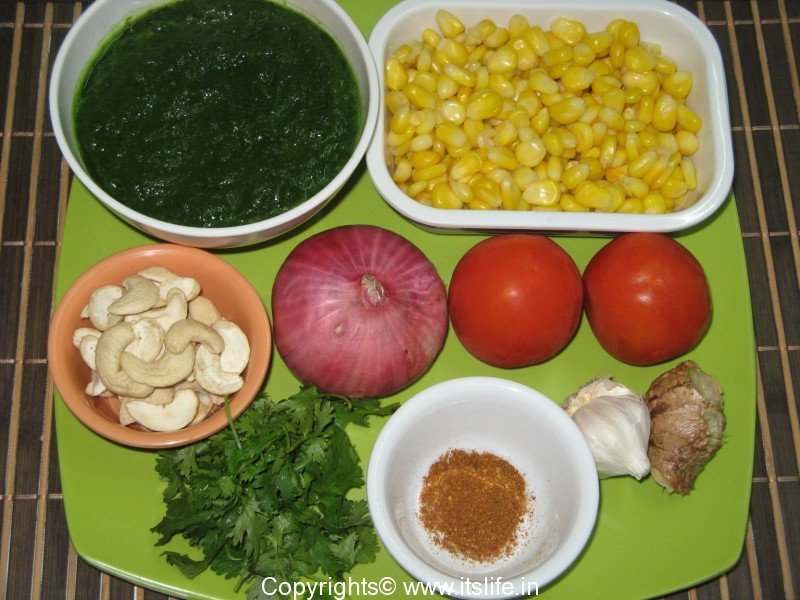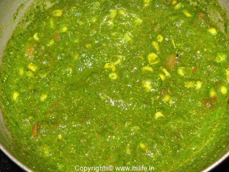 Heat Oil in a pan/kadai and add Onion and sauté until brown. Add the Ginger-Garlic paste and fry for 2 minutes. Add Tomatoes and continue to stir-fry. Add the Garam Masala powder, Chili powder, Makai / Corn, and Palak puree.