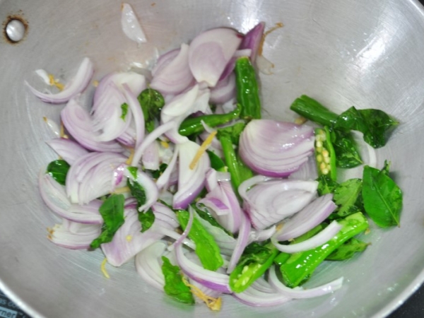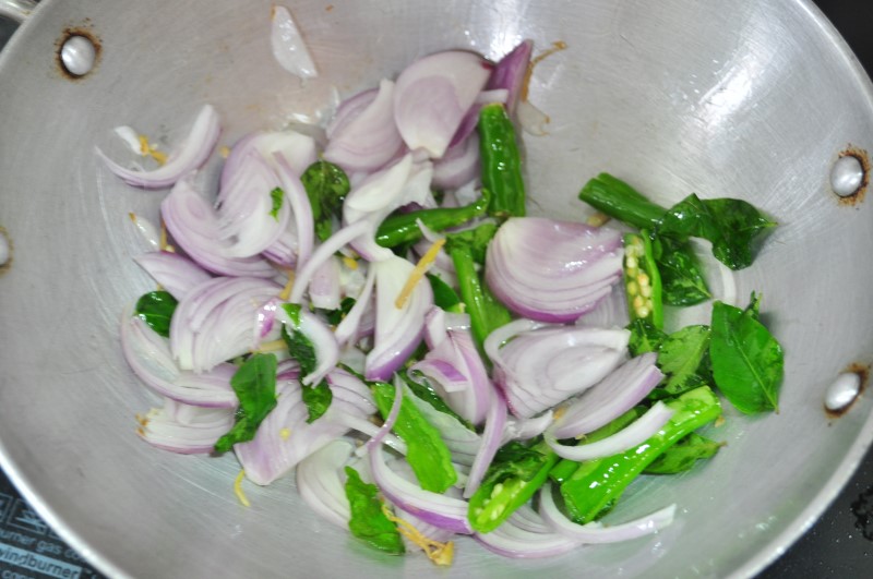 Chop all the vegetables into pieces into any desired shapes and size. Steam Cauliflower, Carrots, Beans, Peas and Potatoes and keep it aside. Heat Oil and add Onions and sauté for a minute, next add Ginger, Curry leaves and Chilies and stir for few seconds.