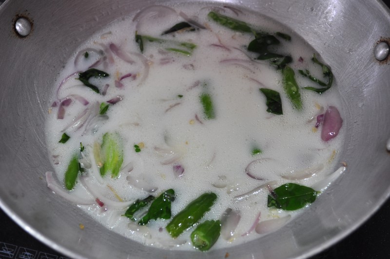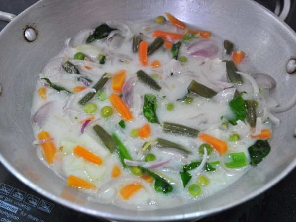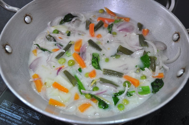 Add the thin Coconut Milk, steamed Vegetables, Garam Masala and Salt. Stir and let it come to a boil.