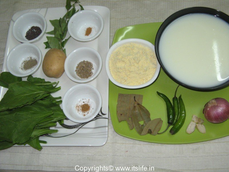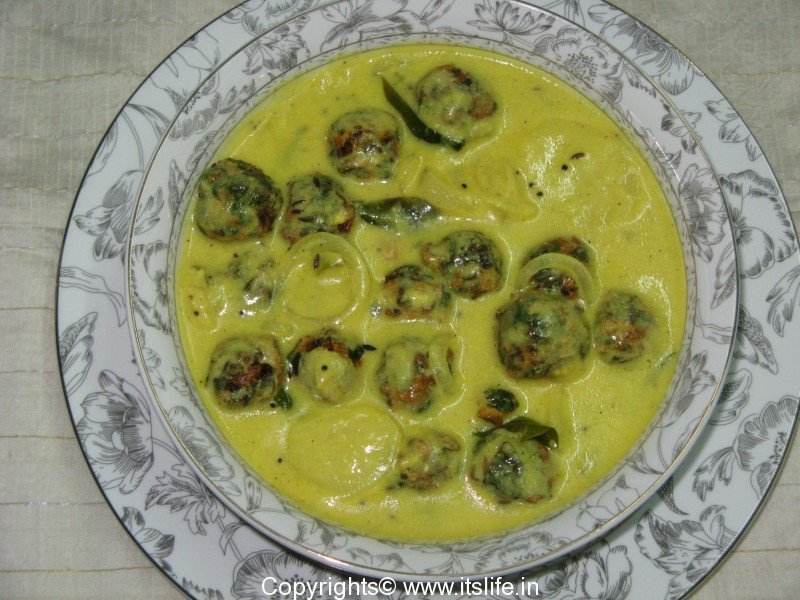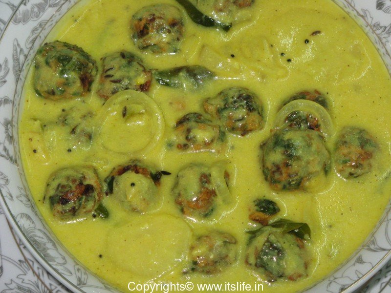 Steaming buttermilk with spices and spinach dumplings.
