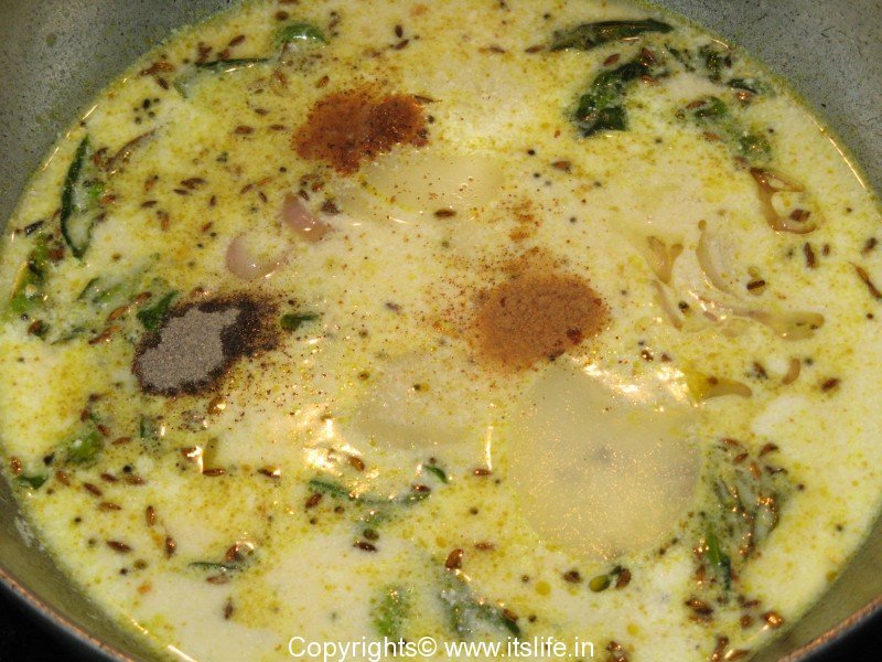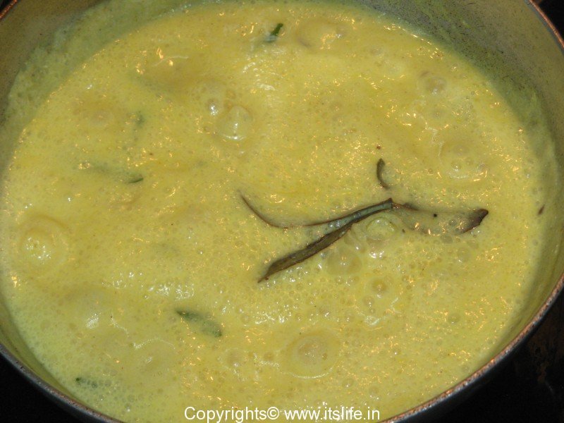 Add Butter milk and let it cook for a minute. Add Besan paste and mix well. Simmer for 3 minutes.