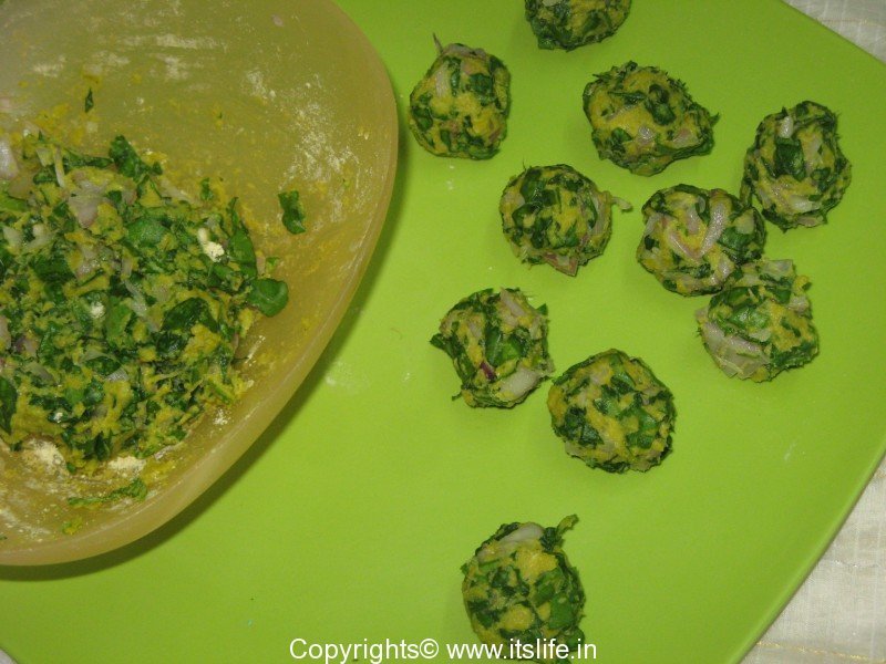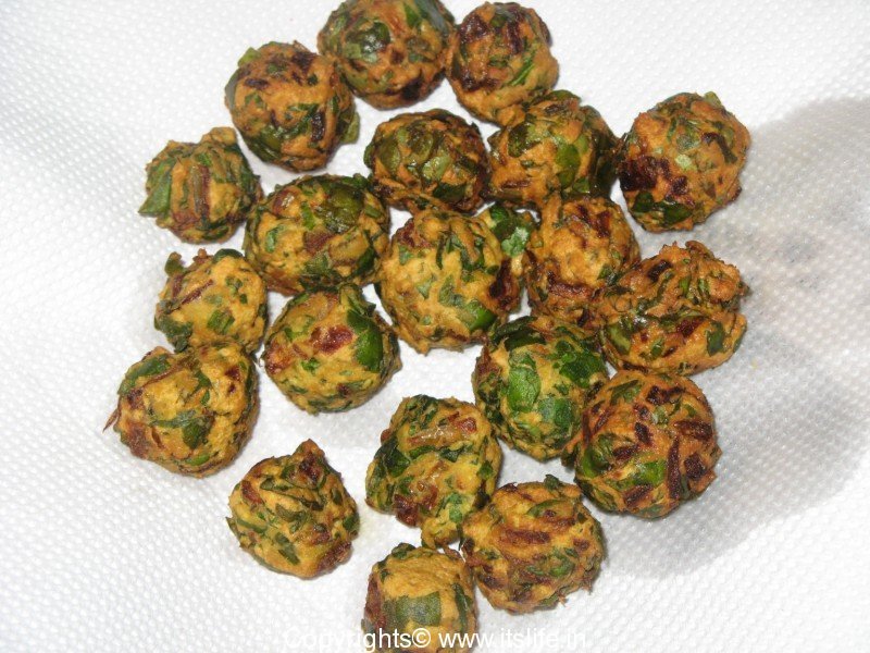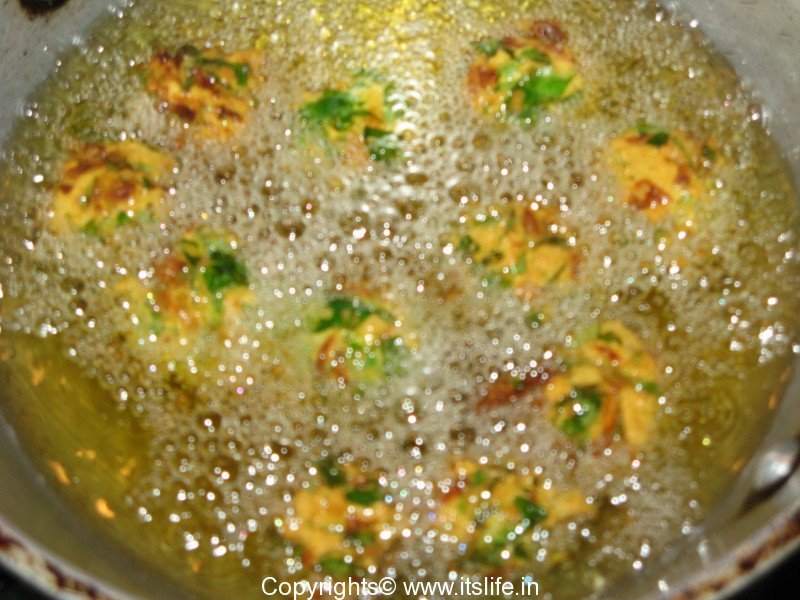 Add few spoons of water and mix to Pakora batter consistency. Shape into small balls and deep fry until brown.