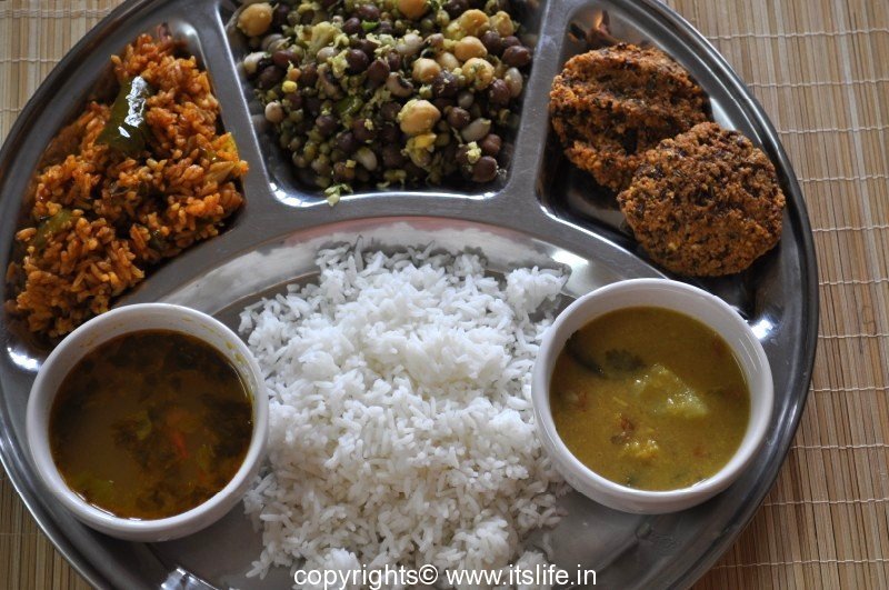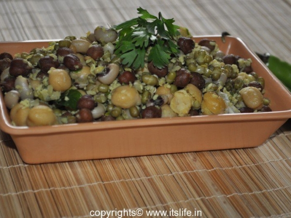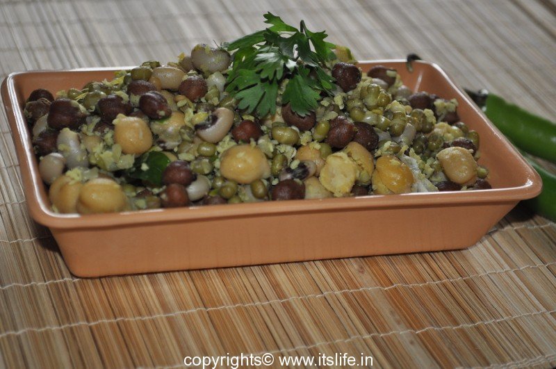 Kalina Usali is prepared using a mixture of whole lentils like Chik Peas, Horse Gram, Green Gram, Cow Peas, Kabuli Peas, and so on.