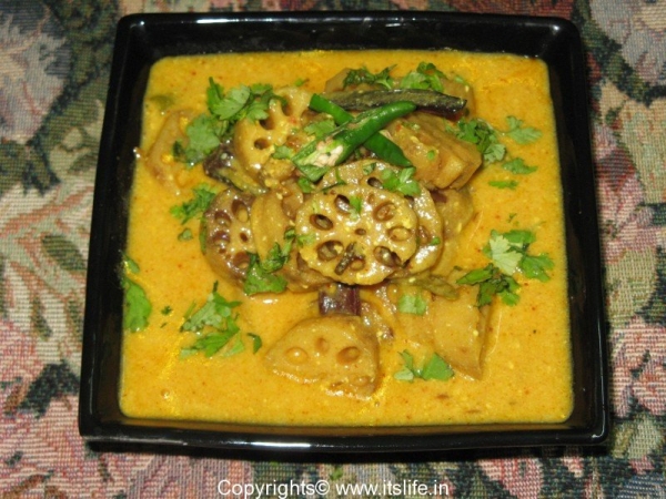 Mix Curd and Besan and add to the cooked Louts Stem.