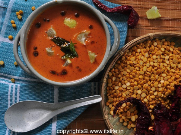 Heat Oil and fry Kadalebele until it changed color, remove and keep aside. In the same Oil fry Red Chilies, Menthya, Hing and Dry Coconut. Grind it to a powder. Extract Tamarind pulp and add water to make one cup of Tamarind water.