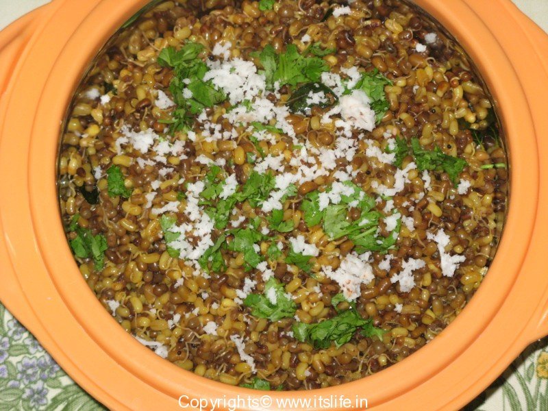 My mami used to prepare this dish for breakfast when we visited them for summer vacations in North Karnataka. The dish is rich in protein and is good for growing children and also keeps them from feeling hungry soon. In Maharashtra this dish is known as Matki Chi Usal.